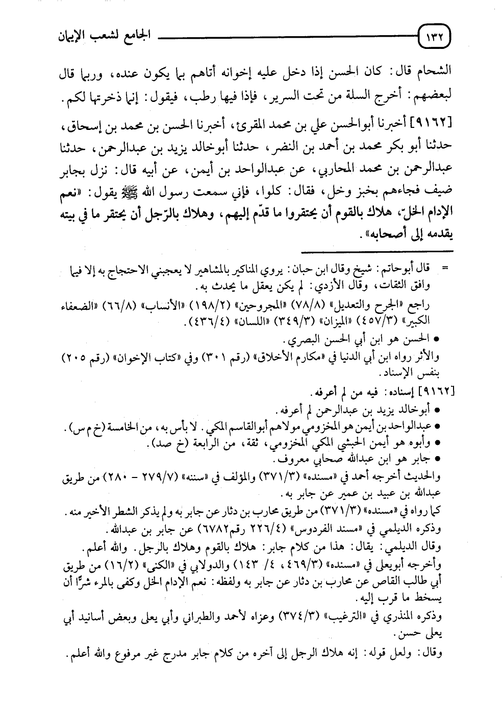 9162 - أَخْبَرَنَا أَبُو الْحُسَيْنِ عَلِيُّ بْنُ مُحَمَّدٍ الْمُقْرِئُ، أَنَا الْحَسَنُ بْنُ مُحَمَّدِ بْنِ إِسْحَاقَ، نَا أَبُو بَكْرٍ مُحَمَّدُ بْنُ أَحْمَدَ بْنِ النَّضْرِ، نَا أَبُو خَالِدٍ يَزِيدُ بْنُ عَبْدِ الرَّحْمَنِ بْنِ مُحَمَّدٍ الْمُحَارِبِيُّ، عَنْ عَبْدِ الْوَاحِدِ بْنِ أَيْمَنَ، عَنْ أَبِيهِ، قَالَ: نَزَلَ بِجَابِرٍ ضَيْفٌ، فَجَاءَهُمْ بِخُبْزٍ وَخَلٍّ، فَقَالَ: كُلُوا، فَإِنِّي سَمِعْتُ رَسُولَ اللهِ صَلَّى اللَّهُ عَلَيْهِ وَسَلَّمَ يَقُولُ: " §نِعْمَ الْإِدَامُ الْخَلُّ، هَلَاكٌ بِالْقَوْمِ أَنْ يَحْتَقِرُوا مَا قُدِّمَ إِلَيْهِمْ، وَهَلَاكٌ بِالرَّجُلِ أَنْ يَحْتَقِرَ مَا فِي بَيْتِهِ يُقَدِّمُهُ إِلَى أَصْحَابِهِ "