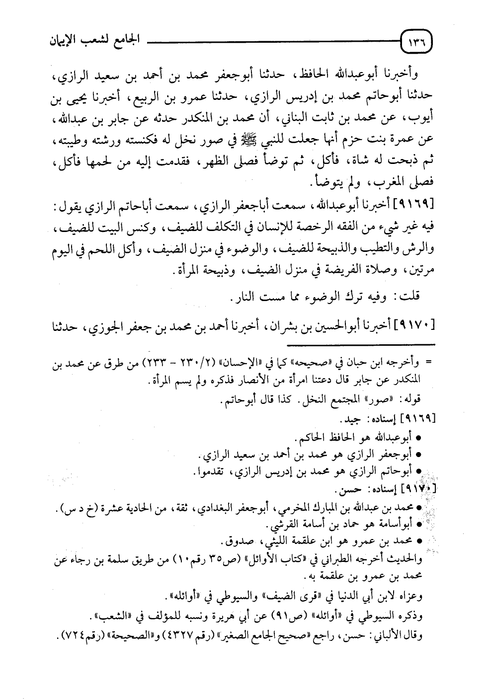 9169 - أَخْبَرَنَا أَبُو عَبْدِ اللهِ، سَمِعْتُ أَبَا جَعْفَرٍ الرَّازِيَّ، سَمِعْتُ أَبَا حَاتِمٍ الرَّازِيَّ، يَقُولُ: فِيهِ غَيْرُ شَيْءٍ مِنَ الْفِقْهِ: " §الرُّخْصَةُ لِلْإِنْسَانِ فِي التَّكَلُّفِ لِلضَّيْفِ، وَكَنَسُ الْبَيْتِ لِلضَّيْفِ، وَالرَّشُ وَالتَّطّيُّبُ وَالذَّبِيحَةُ لِلضَّيْفِ، وَالْوُضُوءُ فِي مَنْزِلِ الضَّيْفِ، وَأَكَلُ اللَّحْمِ فِي الْيَوْمِ مَرَّتَيْنِ، وَصَلَاةُ الْفَرِيضَةِ فِي مَنْزِلِ الضَّيْفِ، وَذَبِيحَةُ الْمَرْأَةِ "، قُلْتُ: وَفِيهِ تَرْكُ الْوُضُوءِ مِمَّا مَسَّتِ النَّارُ