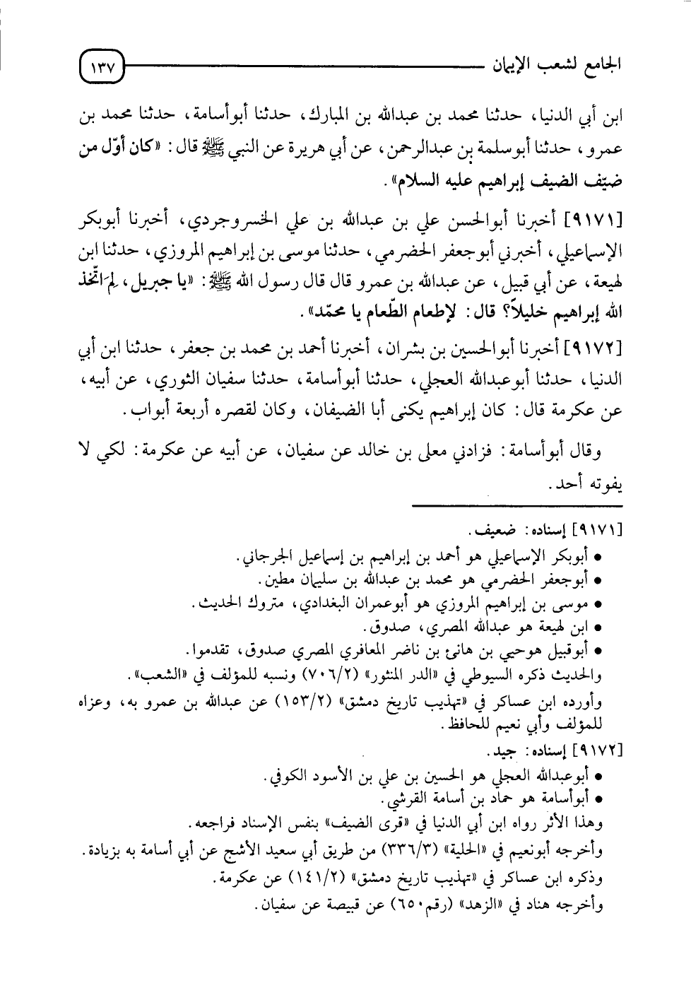 9172 - أَخْبَرَنَا أَبُو الْحُسَيْنِ بْنُ بُشْرَانَ، أَنَا أَحْمَدُ بْنُ مُحَمَّدِ بْنِ جَعْفَرٍ، نَا ابْنُ أَبِي الدُّنْيَا، نَا أَبُو عَبْدِ اللهِ الْعِجْلِيُّ، نَا أَبُو أُسَامَةَ، نَا سُفْيَانُ الثَّوْرِيُّ، عَنْ أَبِيهِ، عَنْ عِكْرِمَةَ، قَالَ: " كَانَ §إِبْرَاهِيمُ يُكْنَى: أَبَا الضِّيفَانِ، وَكَانَ لِقَصْرِهِ أَرْبَعَةُ أَبْوَابٍ "، وَقَالَ أَبُو أُسَامَةَ: فَزَادَنِي يَعْلَى بْنُ خَالِدٍ، عَنْ سُفْيَانَ، عَنْ أَبِيهِ، عَنْ عِكْرِمَةَ " لِكَيْ لَا يَفُوتَهُ أَحَدٌ "