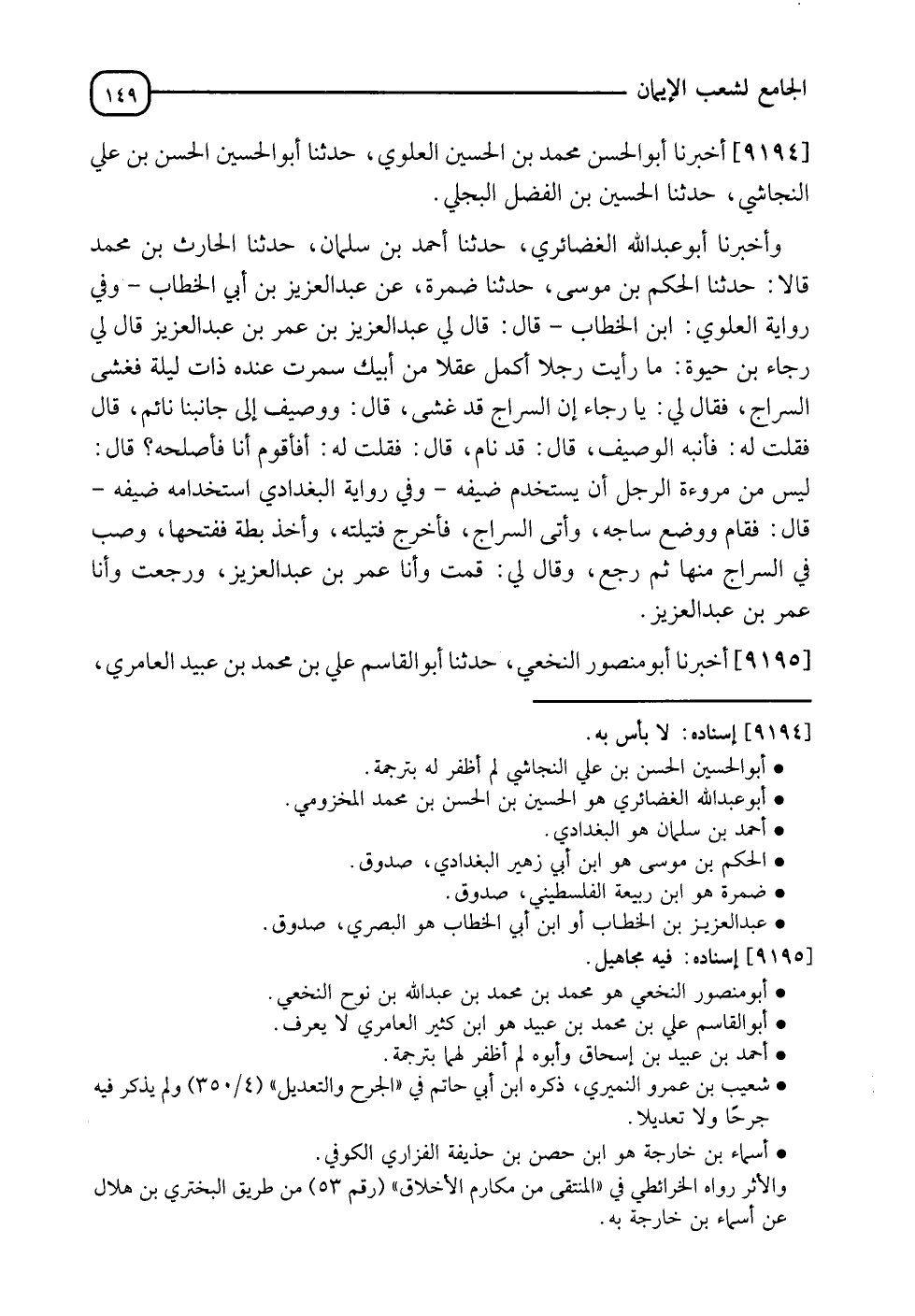 9194 - أَخْبَرَنَا أَبُو الْحَسَنِ مُحَمَّدُ بْنُ الْحُسَيْنِ الْعَلَوِيُّ، نَا أَبُو الْحُسَيْنِ الْحَسَنُ بْنُ عَلِيٍّ النَّجَاشِيُّ، نَا الْحُسَيْنُ بْنُ الْفَضْلِ الْبَجَلِيُّ، وَأَخْبَرَنَا أَبُو عَبْدِ اللهِ الْغَضَائِرِيُّ، نَا أَحْمَدُ بْنُ سَلْمَانَ، نَا الْحَارِثُ بْنُ مُحَمَّدٍ، قَالَا: نَا الْحَكَمُ بْنُ مُوسَى، نَا حَمْزَةُ، عَنْ عَبْدِ الْعَزِيزِ بْنِ أَبِي الْخَطَّابِ، وَفِي رِوَايَةِ الْعَلَوِيِّ بْنِ الْخَطَّابِ، قَالَ: قَالَ لِي عَبْدُ الْعَزِيزِ بْنُ عُمَرَ بْنِ عَبْدِ الْعَزِيزِ، قَالَ: قَالَ لِي رَجَاءُ بْنُ حَيْوَةَ: مَا رَأَيْتُ رَجُلًا أَكْمَلَ عَقْلًا مِنْ أَبِيكَ، سَمَرْتَ عِنْدَهُ ذَاتَ لَيْلَةٍ فَغُشِيَ السِّرَاجُ، فَقَالَ لِي: " يَا رَجَاءُ، إِنَّ السِّرَاجَ قَدْ غُشِيَ "، قَالَ: وَوَصِيفٌ إِلَى جَانِبِنَا نَائِمٌ، قَالَ: فَقُلْتُ لَهُ: فَأَنْبِهِ الْوَصِيفَ، قَالَ: " قَدْ نَامَ "، قَالَ: فَقُلْتُ لَهُ: أَفَأَقُومُ أَنَا فَأُصْلِحُهُ، قَالَ: §" لَيْسَ مِنْ مُرُوءَةِ الرَّجُلِ أَنْ يَسْتَخْدِمَ ضَيْفَهُ " - وَفِي رِوَايَةِ الْبَغْدَادِيِّ: " اسْتِخْدَامُهُ ضَيْفَهُ " - قَالَ: فَقَامَ وَوَضَعَ. . . .، وَأَتَى السِّرَاجَ، وَأَخْرَجَ فَتِيلَتَهُ، وَأَخَذَ. . . . فَفَتَحَهَا، وَصَبَّ فِي السِّرَاجِ مِنْهَا، ثُمَّ رَجَعَ، وَقَالَ لِي: " قُمْتُ وَأَنَا عُمَرُ بْنُ عَبْدِ الْعَزِيزِ، وَرَجَعْتُ وَأَنَا عُمَرُ بْنُ عَبْدِ الْعَزِيزِ "