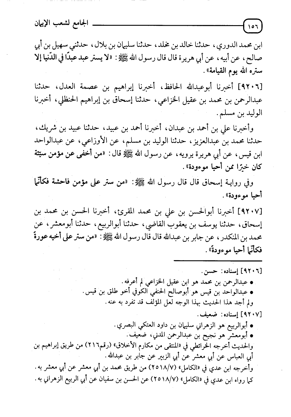 9206 - أَخْبَرَنَا أَبُو عَبْدِ اللهِ الْحَافِظُ، أَنَا إِبْرَاهِيمُ بْنُ عِصْمَةَ الْعَدْلُ، نَا عَبْدُ الرَّحْمَنِ بْنُ مُحَمَّدِ بْنِ عُقَيْلٍ الْخُزَاعِيُّ، نَا إِسْحَاقُ بْنُ إِبْرَاهِيمَ الْحَنْظَلِيُّ، أَنَا الْوَلِيدُ بْنُ مُسْلِمٍ، وَأَخْبَرَنَا عَلِيُّ بْنُ أَحْمَدَ بْنِ عَبْدَانَ، أَنَا أَحْمَدُ بْنُ عُبَيْدٍ، نَا عُبَيْدُ بْنُ شَرِيكٍ، نَا مُحَمَّدُ بْنُ عَبْدِ الْعَزِيزِ، نَا الْوَلِيدُ بْنُ مُسْلِمٍ، عَنِ الْأَوْزَاعِيِّ، عَنْ عَبْدِ الْوَاحِدِ بْنِ قَيْسٍ، عَنْ أَبِي هُرَيْرَةَ، يَرْوِيهِ عَنْ رَسُولِ اللهِ صَلَّى اللَّهُ عَلَيْهِ وَسَلَّمَ، قَالَ: §" مَنْ أَطْفَأَ عَنْ مُؤْمِنٍ سَيِّئَةً كَانَ خَيْرًا مِمَّنْ أَحْيَا مَوْءُودَةً " وَفِي رِوَايَةِ إِسْحَاقَ، قَالَ: قَالَ رَسُولُ اللهِ صَلَّى اللَّهُ عَلَيْهِ وَسَلَّمَ: " مَنْ سَتَرَ عَلَى مُؤْمِنٍ فَاحِشَةً فَكَأَنَّمَا أَحْيَا مَوْءُودَةً "