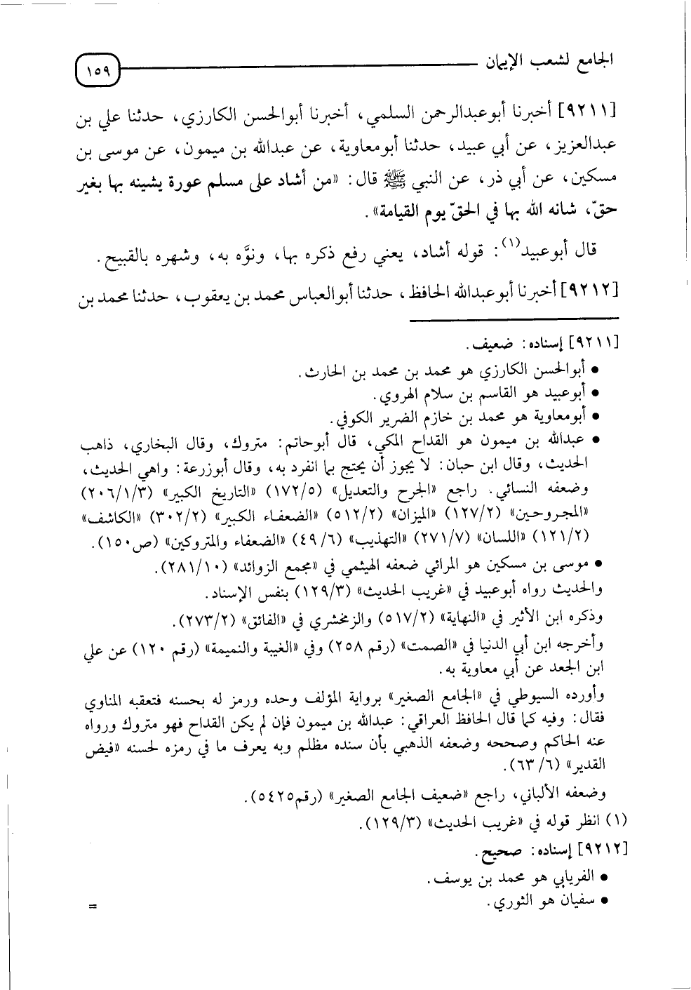 9211 - أَخْبَرَنَا أَبُو عَبْدِ الرَّحْمَنِ السُّلَمِيُّ، أَنَا أَبُو الْحَسَنِ الْكَارِزِيُّ، نَا عَلِيُّ بْنُ عَبْدِ الْعَزِيزِ، عَنْ أَبِي عُبَيْدٍ، نَا أَبُو مُعَاوِيَةَ، عَنْ عَبْدِ اللهِ بْنِ مَيْمُونٍ، عَنْ مُوسَى بْنِ مِسْكِينٍ، عَنْ أَبِي ذَرٍّ، عَنِ النَّبِيِّ صَلَّى اللَّهُ عَلَيْهِ وَسَلَّمَ، قَالَ: §" مَنْ أَشَادَ عَلَى مُسْلِمٍ عَوْرَةً يَشِينُهُ بِهَا بِغَيْرِ حَقٍّ شَانَهُ اللهُ بِهَا فِي الْحَقِّ يَوْمَ الْقِيَامَةِ "، قَالَ أَبُو عُبَيْدٍ: " قَوْلُهُ: أَشَادَ يَعْنِي: رَفَعَ ذِكْرَهُ بِهَا، وَنَوَّهَ بِهِ، وَشَهَّرَهُ بِالْقَبِيحِ "