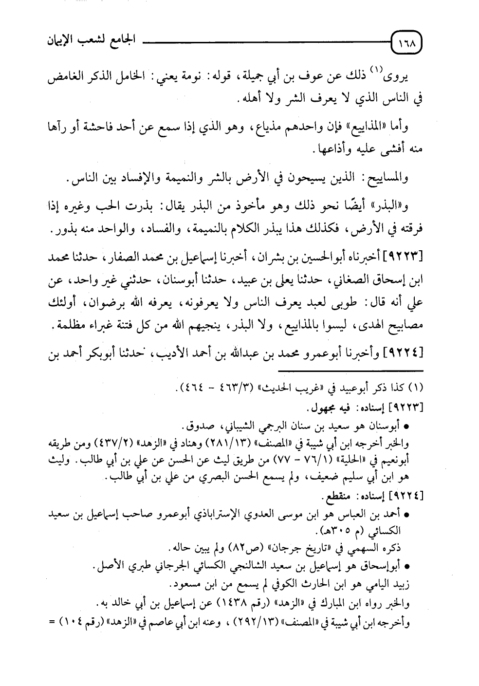 9224 - وَأَخْبَرَنَا أَبُو عَمْرٍو مُحَمَّدُ بْنُ عَبْدِ اللهِ بْنِ أَحْمَدَ الْأَدِيبُ، نَا أَبُو بَكْرٍ أَحْمَدُ بْنُ -[169]- إِبْرَاهِيمَ الْإِسْمَاعِيلِيُّ، نَا أَحْمَدُ بْنُ الْعَبَّاسِ، أَنَا أَبُو إِسْحَاقَ، نَا يَعْلَى بْنُ عُبَيْدٍ، عَنْ إِسْمَاعِيلَ بْنِ أَبِي خَالِدٍ، عَنْ زُبَيْدٍ الْيَافِيِّ، قَالَ: قَالَ عَبْدُ اللهِ: " §قُولُوا خَيْرًا تُعْرَفُوا بِهِ وَاعْمَلُوا بِهِ، تَكُونُوا مِنْ أَهْلِهِ، وَلَا تَكُونُوا عُجَلَاءَ مَذَايِيعَ بُذُرًا "