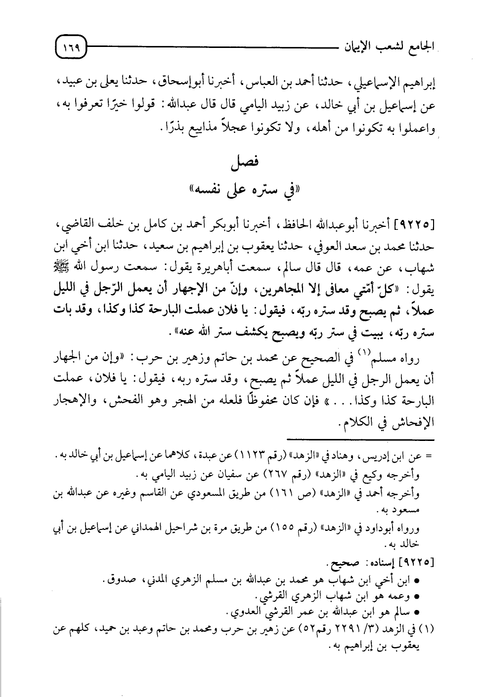 9225 - أَخْبَرَنَا أَبُو عَبْدِ اللهِ الْحَافِظُ، أَنَا أَبُو بَكْرٍ أَحْمَدُ بْنُ كَامِلِ بْنِ خَلَفٍ الْقَاضِي، نَا مُحَمَّدُ بْنُ سَعْدٍ الْعَوْفِيُّ، نَا يَعْقُوبُ بْنُ إِبْرَاهِيمَ بْنِ سَعْدٍ، نَا ابْنُ أَخِي ابْنِ شِهَابٍ، عَنْ عَمِّهِ، قَالَ: قَالَ سَالِمٌ: سَمِعْتُ أَبَا هُرَيْرَةَ، يَقُولُ: سَمِعْتُ رَسُولَ اللهِ صَلَّى اللَّهُ عَلَيْهِ وَسَلَّمَ، يَقُولُ: " §كُلُّ أُمَّتِي مُعَافًى إِلَّا الْمُجَاهِرِينَ، وَإِنَّ مِنَ الْإِجْهَارِ أَنْ يَعْمَلَ الرَّجُلُ فِي اللَّيْلِ عَمَلًا ثُمَّ يُصْبِحُ وَقَدْ سَتَرَهُ رَبُّهُ، فَيَقُولُ: يَا فُلَانٌ، عَمِلْتُ الْبَارِحَةَ كَذَا كَذَا، وَقَدْ بَاتَ يَسْتُرُهُ رَبُّهُ يَبِيتُ فِي سِتْرِ رَبِّهِ وَيُصْبِحُ يَكْشِفُ سِتْرَ اللهِ عَنْهُ "، " رَوَاهُ مُسْلِمٌ فِي الصَّحِيحِ، عَنْ مُحَمَّدِ بْنِ حَاتِمٍ، وَزُهَيْرِ بْنِ حَرْبٍ، وَإِنَّ مِنَ الْجِهَارِ فَإِنْ كَانَ مَحْفُوظًا فَلَعَلَّهُ مِنَ الْهُجْرِ، وَهُوَ الْفُحْشُ وَالْإِفْجَارُ، إِفْحَاشٌ فِي الْكَلَامِ، -[170]- رَوَاهُ الْبُخَارِيُّ، عَنِ الْأَوْسِ، عَنْ إِبْرَاهِيمَ بْنِ سَعْدٍ، عَنِ ابْنِ أَخِي ابْنِ شِهَابٍ، وَقَالَ: وَإِنَّ مِنَ الْمَجَانَةِ "