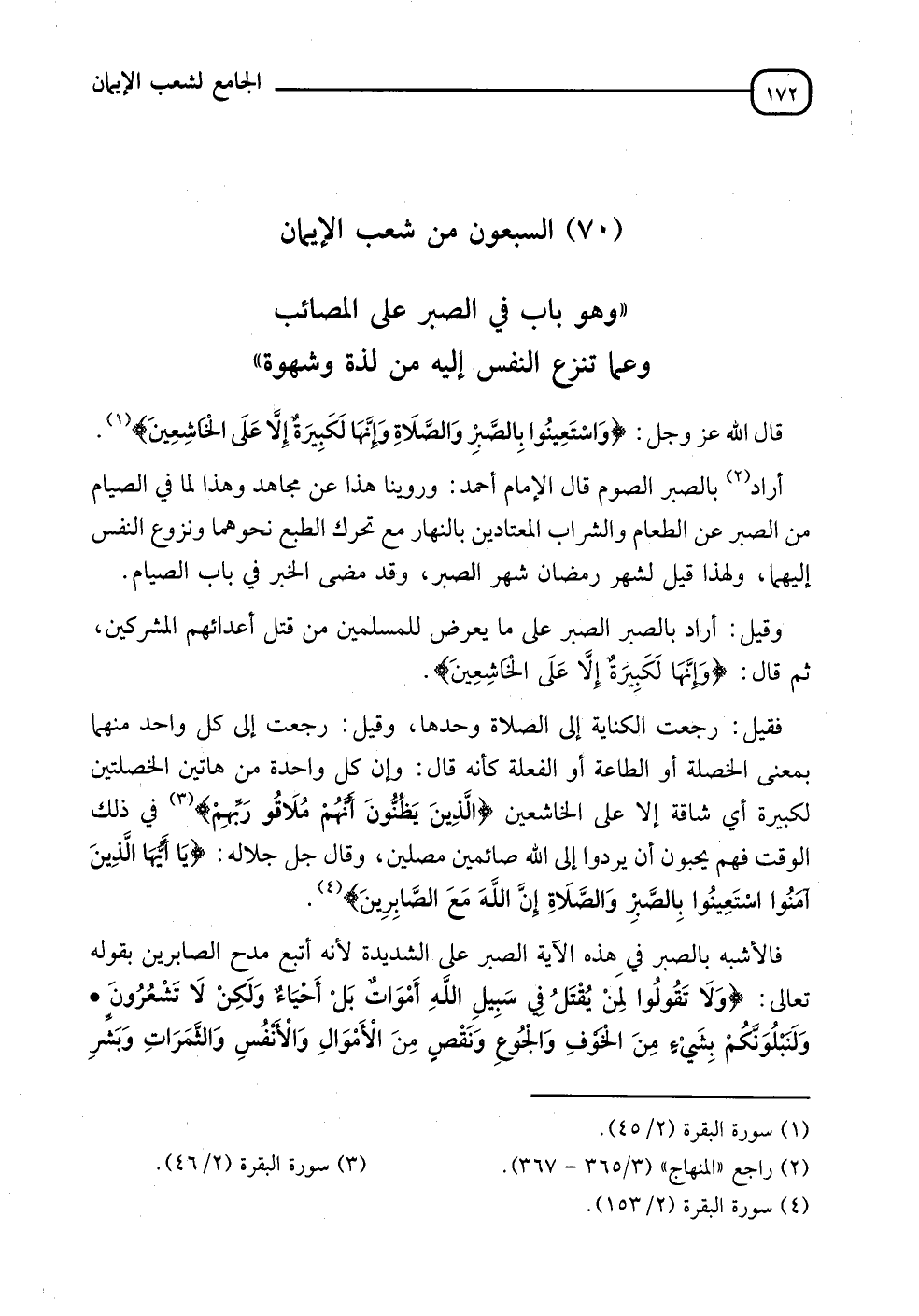 بَابٌ فِي الصَّبْرِ عَلَى الْمَصَائِبِ، وَعَمَّا تَنْزِعُ إِلَيْهِ النَّفْسُ مِنْ لَذَّةٍ وَشَهْوَةٍ " قَالَ اللهُ عَزَّ وَجَلَّ: {وَاسْتَعِينُوا بِالصَّبْرِ وَالصَّلَاةِ وَإِنَّهَا لَكَبِيرَةٌ إِلَّا عَلَى الْخَاشِعِينَ} [البقرة: 45]، أَرَادَ بِالصَّبْرِ الصَّوْمَ "، قَالَ الْإِمَامُ أَحْمَدُ