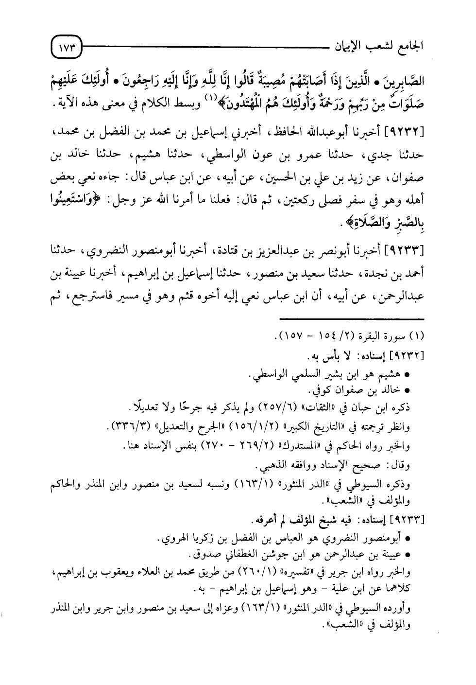 9233 - أَخْبَرَنَا أَبُو نَصْرٍ عُمَرُ بْنُ عَبْدِ الْعَزِيزِ بْنِ قَتَادَةَ، نَا أَبُو مَنْصُورٍ النَّضْرَوِيُّ، نَا أَحْمَدُ بْنُ نَجْدَةَ، نَا سَعِيدُ بْنُ مَنْصُورٍ، نَا إِسْمَاعِيلُ بْنُ إِبْرَاهِيمَ، أَنَا عُيَيْنَةُ بْنُ عَبْدِ الرَّحْمَنِ، عَنْ أَبِيهِ، أَنَّ ابْنَ عَبَّاسٍ، نُعِيَ إِلَيْهِ أَخُوهُ قُثَمٌ وَهُوَ فِي مَسِيرٍ، فَاسْتَرْجَعَ، ثُمَّ -[174]- تَنَحَّى عَنِ الطَّرِيقِ، ثُمَّ صَلَّى رَكْعَتَيْنِ فَأَطَالَ فِيهِمَا الْجُلُوسَ، ثُمَّ قَامَ يَمْشِي إِلَى رَاحِلَتِهِ، وَهُوَ يَقُولُ: " {§وَاسْتَعِينُوا بِالصَّبْرِ وَالصَّلَاةِ وَإِنَّهَا لَكَبِيرَةٌ إِلَّا عَلَى الْخَاشِعِينَ} [البقرة: 45] "