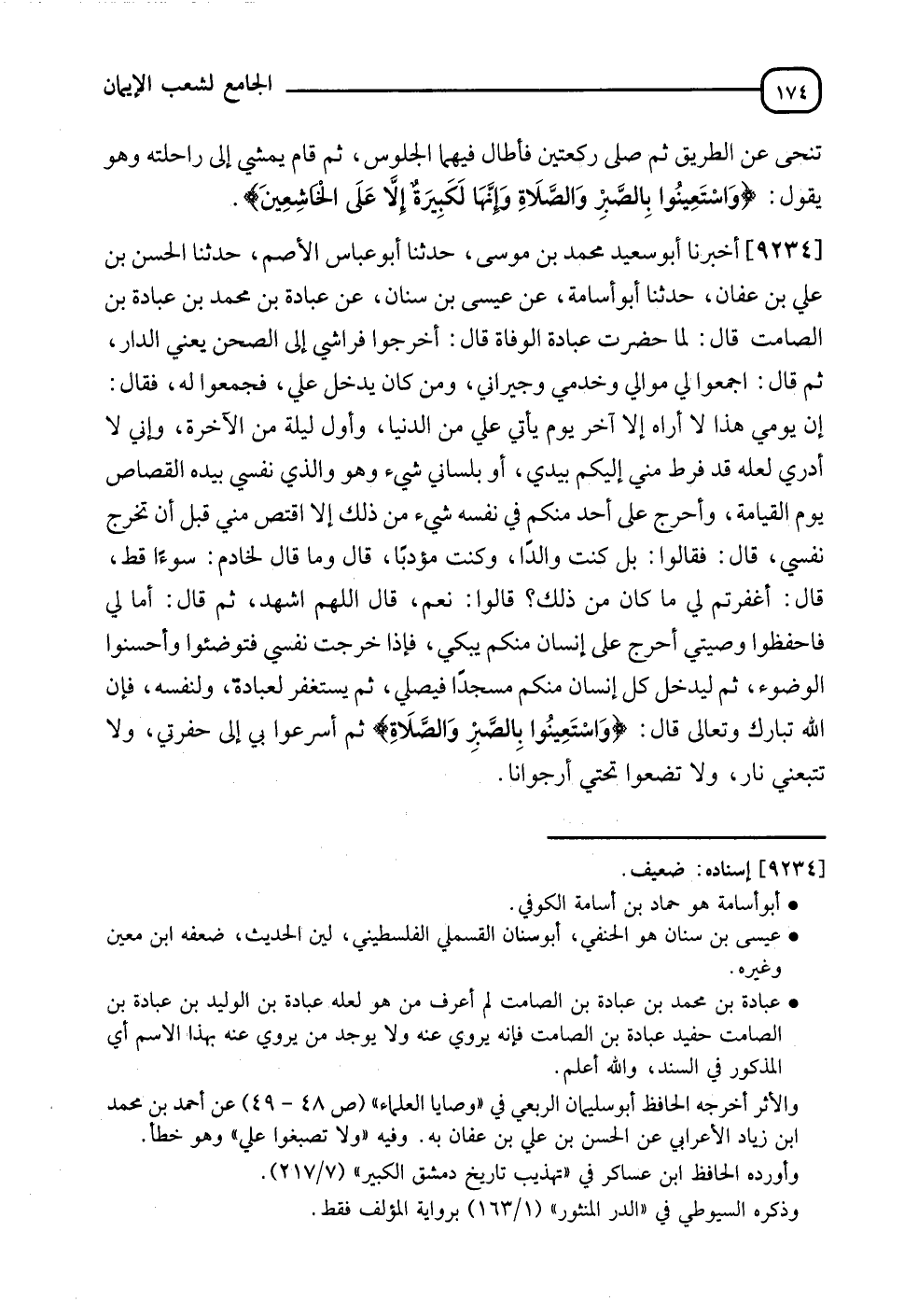 9234 - أَخْبَرَنَا أَبُو سَعِيدٍ مُحَمَّدُ بْنُ مُوسَى، نَا أَبُو الْعَبَّاسِ الْأَصَمُّ، نَا الْحَسَنُ بْنُ عَلِيِّ بْنِ عَفَّانَ، نَا أَبُو أُسَامَةَ، عَنْ عِيسَى بْنِ سِنَانٍ، عَنْ عُبَادَةَ بْنِ مُحَمَّدِ بْنِ عُبَادَةَ بْنِ الصَّامِتِ، قَالَ: لَمَّا حَضَرَتْ عُبَادَةَ الْوَفَاةُ، قَالَ: " أَخْرِجُوا فِرَاشِي إِلَى الصَّحْنِ " - يَعْنِي: الدَّارَ - ثُمَّ قَالَ: " اجْمَعُوا إِلَيَّ مَوَالِيَّ، وَخَدَمِي، وَجِيرَانِي، وَمَنْ كَانَ يَدْخُلُ عَلَيَّ ". فَجَمَعُوا لَهُ، فَقَالَ: " إِنَّ يَوْمِي هَذَا لَا أُرَاهُ إِلَّا آخِرَ يَوْمٍ يَأْتِي عَلَيَّ مِنَ الدُّنْيَا وَأَوَّلَ لَيْلَةٍ مِنَ الْآخِرَةِ، وَإِنِّي لَا أَدْرِي لَعَلَّهُ قَدْ فَرَطَ مِنِّي إِلَيْكُمْ بِيَدِي أَوْ بِلِسَانِي شَيْءٍ، وَهُوَ وَالَّذِي نَفْسِي بِيَدِهِ الْقَصَاصُ يَوْمَ الْقِيَامَةِ، وَأُحَرِّجُ عَلَى أَحَدٍ مِنْكُمْ فِي نَفْسِهِ شَيْءٌ مِنْ ذَلِكَ إِلَّا اقْتَصَّ مِنِّي قَبْلَ أَنْ تَخْرُجَ نَفْسِي "، قَالَ: فَقَالُوا: بَلْ كُنْتَ وَالِدًا، وَكُنْتَ مُؤَدِّبًا، قَالَ: وَمَا قَالَ لِخَادِمٍ سُوءًا قَطُّ. فَقَالَ: " أَغَفَرْتُمْ لِي مَا كَانَ مِنْ ذَلِكَ "، قَالُوا: نَعَمْ. قَالَ: " اللهُمَّ اشْهَدْ ". فَقَالَ: " أَمَّا لِي فَاحْفَظُوا وَصِيَّتِي، أُحَرِّجُ عَلَى إِنْسَانٍ مِنْكُمْ يَبْكِي، §فَإِذَا أُخْرِجَتْ نَفْسِي فَتَوَضَئُوا وَأَحْسِنُوا الْوُضُوءَ، ثُمَّ لِيَدْخُلْ كُلُّ إِنْسَانٍ مِنْكُمْ مَسْجِدًا فَيُصَلِّي ثُمَّ يَسْتَغْفِرُ لِعُبَادَةَ وَلِنَفْسِهِ، فَإِنَّ اللهَ تَبَارَكَ وَتَعَالَى قَالَ: {اسْتَعِينُوا بِالصَّبْرِ وَالصَّلَاةِ} [البقرة: 153]، ثُمَّ أَسْرِعُوا بِي إِلَى حُفْرَتِي، وَلَا تَتْبَعُنِي نَارٌ، وَلَا تَضَعُوا تَحْتِي أُرْجُوانًا "