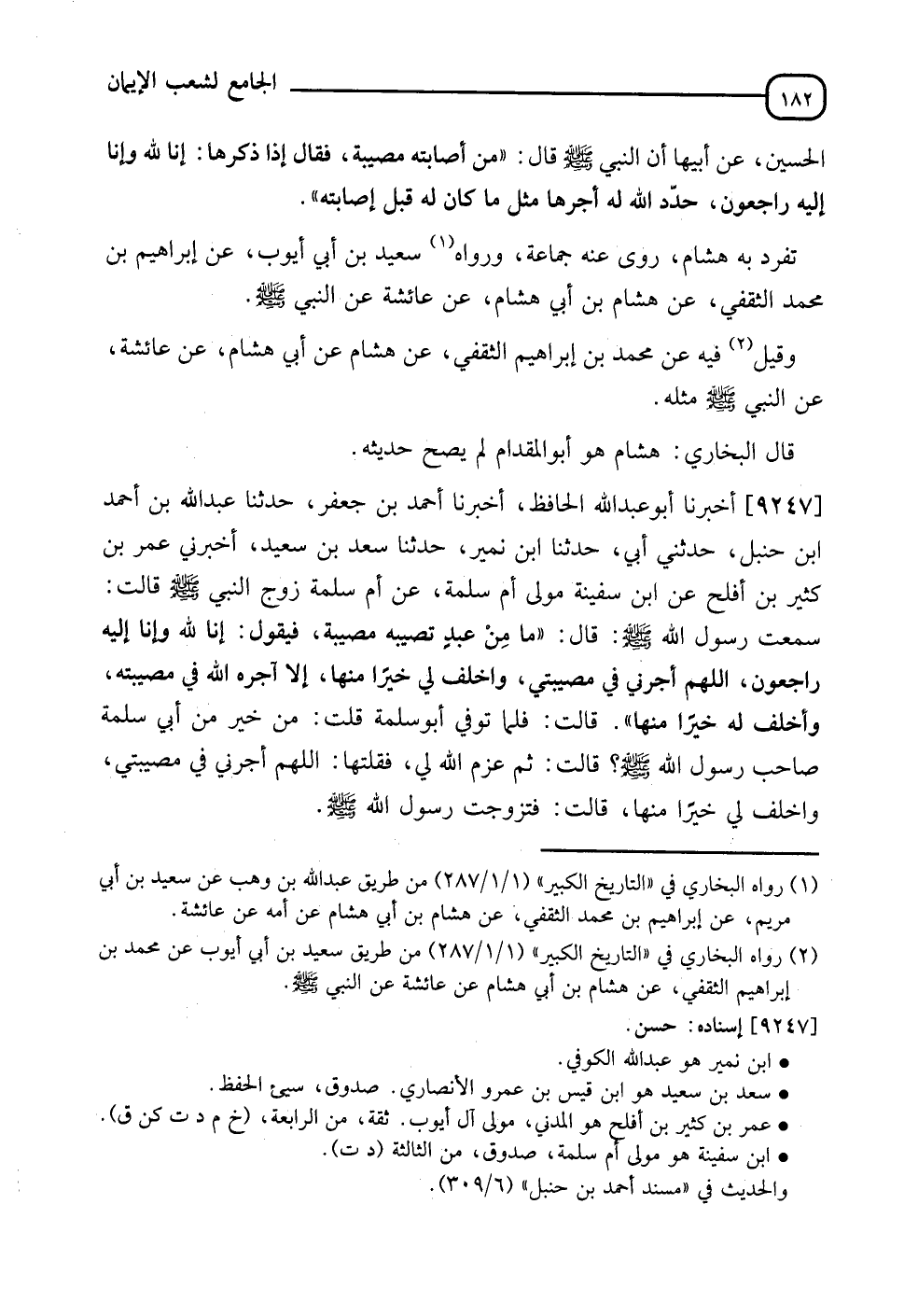 9247 - أَخْبَرَنَا أَبُو عَبْدِ اللهِ الْحَافِظُ، أَنَا أَحْمَدُ بْنُ جَعْفَرٍ، نَا عَبْدُ اللهِ بْنُ أَحْمَدَ بْنِ حَنْبَلَ، حَدَّثَنِي أَبِي، نَا ابْنُ نُمَيْرٍ، نَا سَعْدُ بْنُ سَعِيدٍ، أَخْبَرَنِي عُمَرُ بْنُ كَثِيرِ بْنِ أَفْلَحَ، عَنْ أَبِي سَفِينَةَ مَوْلَى أُمِّ سَلَمَةَ، عَنْ أُمِّ سَلَمَةَ زَوْجِ النَّبِيِّ صَلَّى اللَّهُ عَلَيْهِ وَسَلَّمَ، قَالَتْ: سَمِعْتُ رَسُولَ اللهِ صَلَّى اللَّهُ عَلَيْهِ وَسَلَّمَ يَقُولُ: " §مَا مِنْ عَبْدٍ تُصِيبُهُ مُصِيبَةٌ فَيَقُولُ: إِنَّا لِلَّهِ وَإِنَّا إِلَيْهِ رَاجِعُونَ، اللهُمَّ أْجُرْنِي فِي مُصِيبَتِي وَاخْلُفْ لِي خَيْرًا مِنْهَا، إِلَّا آجَرَهُ اللهُ فِي مُصِيبَتِهِ وَأَخْلَفَ لَهُ خَيْرًا مِنْهَا "، قَالَتْ: فَلَمَّا تُوُفِّيَ أَبُو سَلَمَةَ قُلْتُ: مَنْ خَيْرٌ مِنْ أَبِي سَلَمَةَ صَاحِبِ رَسُولِ اللهِ صَلَّى اللَّهُ عَلَيْهِ وَسَلَّمَ، قَالَتْ: ثُمَّ عَزَمَ اللهُ لِي فَقُلْتُهَا: اللهُمَّ أْجُرْنِي عَنْ مُصِيبَتِي وَاخْلُفْ لِي خَيْرًا مِنْهَا، قَالَتْ: فَتَزَوَّجْتُ رَسُولَ اللهِ صَلَّى اللَّهُ عَلَيْهِ وَسَلَّمَ -[183]-
