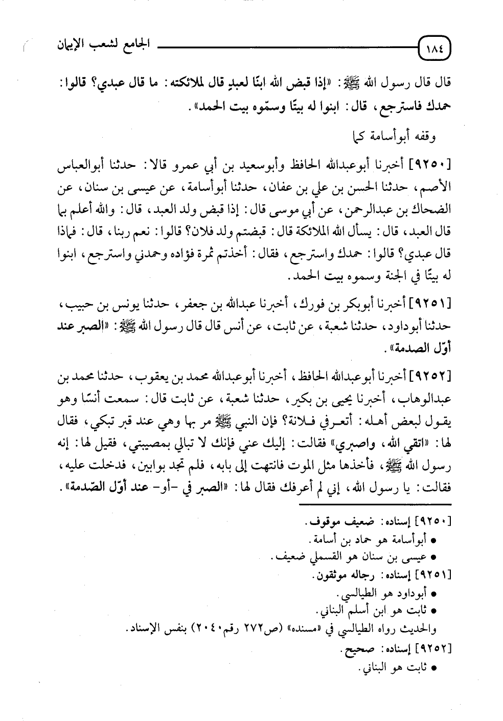 9250 - أَخْبَرَنَا أَبُو عَبْدِ اللهِ الْحَافِظُ، وَأَبُو سَعِيدِ بْنِ أَبِي عَمْرٍو، قَالَا: نَا أَبُو الْعَبَّاسِ الْأَصَمُّ، نَا الْحَسَنُ بْنُ عَلِيِّ بْنِ عَفَّانَ، نَا أَبُو أُسَامَةَ، عَنْ عِيسَى بْنِ سِنَانٍ، عَنِ الضَّحَّاكِ بْنِ عَبْدِ الرَّحْمَنِ، عَنْ أَبِي مُوسَى، قَالَ: " §إِذَا قُبِضَ وَلَدُ الْعَبْدِ قَالَ، وَاللهُ أَعْلَمُ بِمَا قَالَ الْعَبْدُ، قَالَ: يَسْأَلُ اللهُ الْمَلَائِكَةَ، فَقَالَ: قَبَضْتُمْ وَلَدَ فُلَانٍ، قَالُوا: نَعَمْ رَبَّنَا. قَالَ: فَمَاذَا قَالَ عَبْدِي، قَالَ: حَمِدَكَ وَاسْتَرْجَعَ، فَقَالَ: أَخَذْتُمْ ثَمَرَةَ فُؤَادِهِ وَحَمِدَنِي وَاسْتَرْجَعَ، ابْنُوا لَهُ بَيْتًا فِي الْجَنَّةِ وَسَمُّوهُ بَيْتَ الْحَمْدِ "