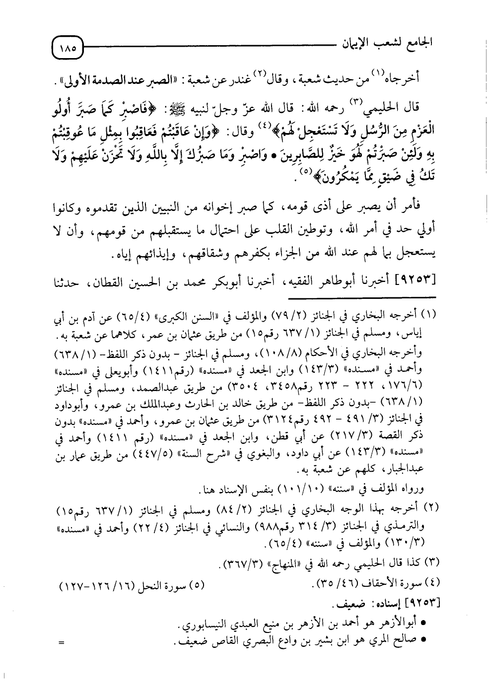 9253 - أَخْبَرَنَا أَبُو طَاهِرٍ الْفَقِيهُ، أَنَا أَبُو بَكْرٍ مُحَمَّدُ بْنُ الْحُسَيْنِ الْقَطَّانُ، نَا -[186]- أَبُو الْأَزْهَرِ، نَا الْهَيْثَمُ بْنُ جَمِيلٍ، نَا صَالِحٌ الْمُرِّيُ، عَنْ سُلَيْمَانَ التَّيْمِيِّ، عَنْ أَبِي عُثْمَانَ النَّهْدِيِّ، عَنْ أَبِي هُرَيْرَةَ، أَنَّ النَّبِيَّ صَلَّى اللَّهُ عَلَيْهِ وَسَلَّمَ وَقَفَ عَلَى حَمْزَةَ بْنِ عَبْدِ الْمُطَّلِبِ حِينَ اسْتُشْهِدَ، فَنَظَرَ إِلَى شَيْءٍ لَمْ يَنْظُرْ إِلَى شَيْءٍ قَطُّ كَانَ أَوْجَعَ لِقَلْبِهِ مِنْهُ، فَنَظَرَ إِلَيْهِ قَدْ مُثِّلَ بِهِ، فَقَالَ: " رَحْمَةُ اللهِ عَلَيْكَ، فَإِنَّكَ كُنْتُ مَا عَلِمْتُكَ إِلَّا فَعَّالًا لِلْخَيْرَاتِ وَصُولًا لِلرَّحِمِ، وَلَوْلَا حُزْنُ مَنْ بَعْدَكَ لَسَرَّنِي أَنْ أَدَعَكَ حَتَّى تُحْشَرَ مِنْ أَفْوَاهٍ شَتَّى، أَمَا وَاللهِ عَلَى ذَلِكَ لَأُمَثِّلَنَّ بِسَبْعِينَ مِنْهُمْ مَكَانَكَ ". قَالَ: فَنَزَلَ جِبْرِيلُ عَلَيْهِ السَّلَامُ عَلَى النَّبِيِّ صَلَّى اللَّهُ عَلَيْهِ وَسَلَّمَ وَهُوَ وَاقِفٌ بِخَوَاتِيمَ سُورَةِ النَّحْلِ الْآيَةِ: {§وَإِنْ عَاقَبْتُمْ فَعَاقِبُوا بِمِثْلِ مَا عُوقِبْتُمْ بِهِ وَلَئِنْ صَبَرْتُمْ لَهُوَ خَيْرٌ لِلصَّابِرِينَ} [النحل: 126]، فَصَبَرَ النَّبِيُّ صَلَّى اللَّهُ عَلَيْهِ وَسَلَّمَ، وَكَفَّرَ عَنْ يَمِينِهِ، وَأَمْسَكَ عَمَّا أَرَادَ