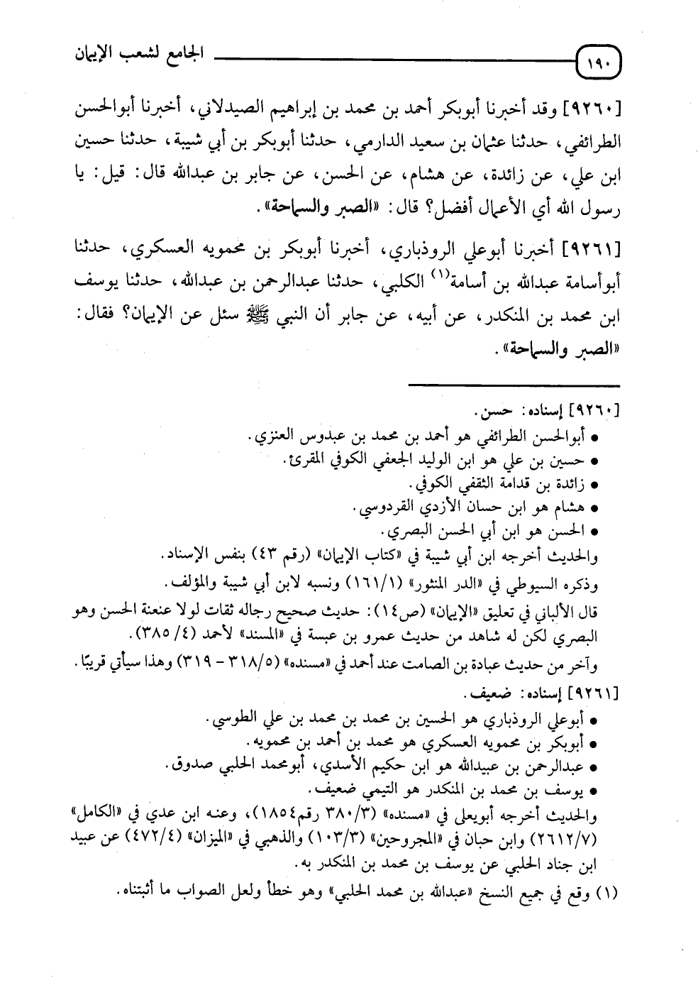 9261 - وَأَخْبَرَنَا أَبُو عَلِيٍّ الرُّوذْبَارِيُّ، أَنَا أَبُو بَكْرِ بْنُ مَحْمُوَيْهِ الْعَسْكَرِيُّ، نَا أَبُو أُسَامَةَ عَبْدُ اللهِ بْنُ مُحَمَّدٍ الْحَلَبِيُّ، نَا عَبْدُ الرَّحْمَنِ بْنُ عَبْدِ اللهِ، نَا يُوسُفُ بْنُ مُحَمَّدِ بْنِ الْمُنْكَدِرِ، عَنْ أَبِيهِ، عَنْ جَابِرٍ، أَنَّ النَّبِيَّ صَلَّى اللَّهُ عَلَيْهِ وَسَلَّمَ سُئِلَ عَنِ §الْإِيمَانِ، قَالَ: " الصَّبْرُ وَالسَّمَاحَةُ "