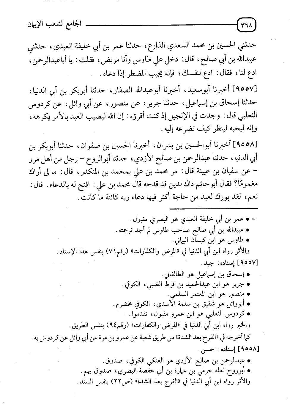 9557 - أَخْبَرَنَا أَبُو سَعِيدٍ , أَنَا أَبُو عَبْدِ اللهِ الصَّفَّارُ , نَا أَبُو بَكْرِ بْنُ أَبِي الدُّنْيَا , نَا إِسْحَاقُ بْنُ إِسْمَاعِيلَ , نَا جَرِيرٌ , عَنْ مَنْصُورٍ , عَنْ أَبِي وَائِلٍ , عَنْ كُرْدُوسٍ التَّغْلِبِيِّ , قَالَ: " وَجَدْتُ فِي الْإِنْجِيلِ إِذْ كُنْتُ أَقْرَأَهُ: إِنَّ §اللهَ لَيُصِيبُ الْعَبْدَ بِالْأَمْرِ يَكْرَهُهُ , وَإِنَّهُ لَيُحِبُّهُ لِيَنْظُرَ كَيْفَ تَضَرُّعُهُ إِلَيْهِ "