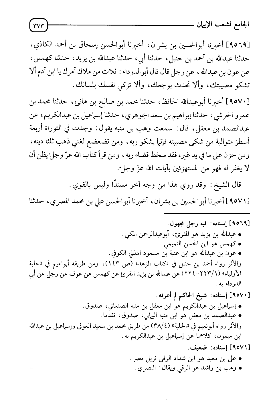 9569 - أَخْبَرَنَا أَبُو الْحُسَيْنِ بْنُ بُشْرَانَ , أَنَا أَبُو الْحَسَنِ إِسْحَاقُ بْنُ أَحْمَدَ الْكَاذِيُّ , نَا عَبْدُ اللهِ بْنُ أَحْمَدَ بْنِ حَنْبَلَ , نَا أَبِي , نَا عَبْدُ اللهِ بْنُ يَزِيدَ , نَا كَهْمَسٌ , عَنْ عَوْنِ بْنِ عَبْدِ اللهِ , عَنْ رَجُلٍ , قَالَ: قَالَ أَبُو الدَّرْدَاءِ: " §ثَلَاثٌ مِنْ مِلَاكِ أَمَرِكَ يَا ابْنَ آدَمَ: أَنْ لَا تَشْكُو مُصِيبَتَكَ , وَأَنْ لَا تُحَدِّثَ بِوَجَعِكَ , وَأَنْ لَا تُزَكِّي نَفْسَكَ بِلِسَانِكَ "