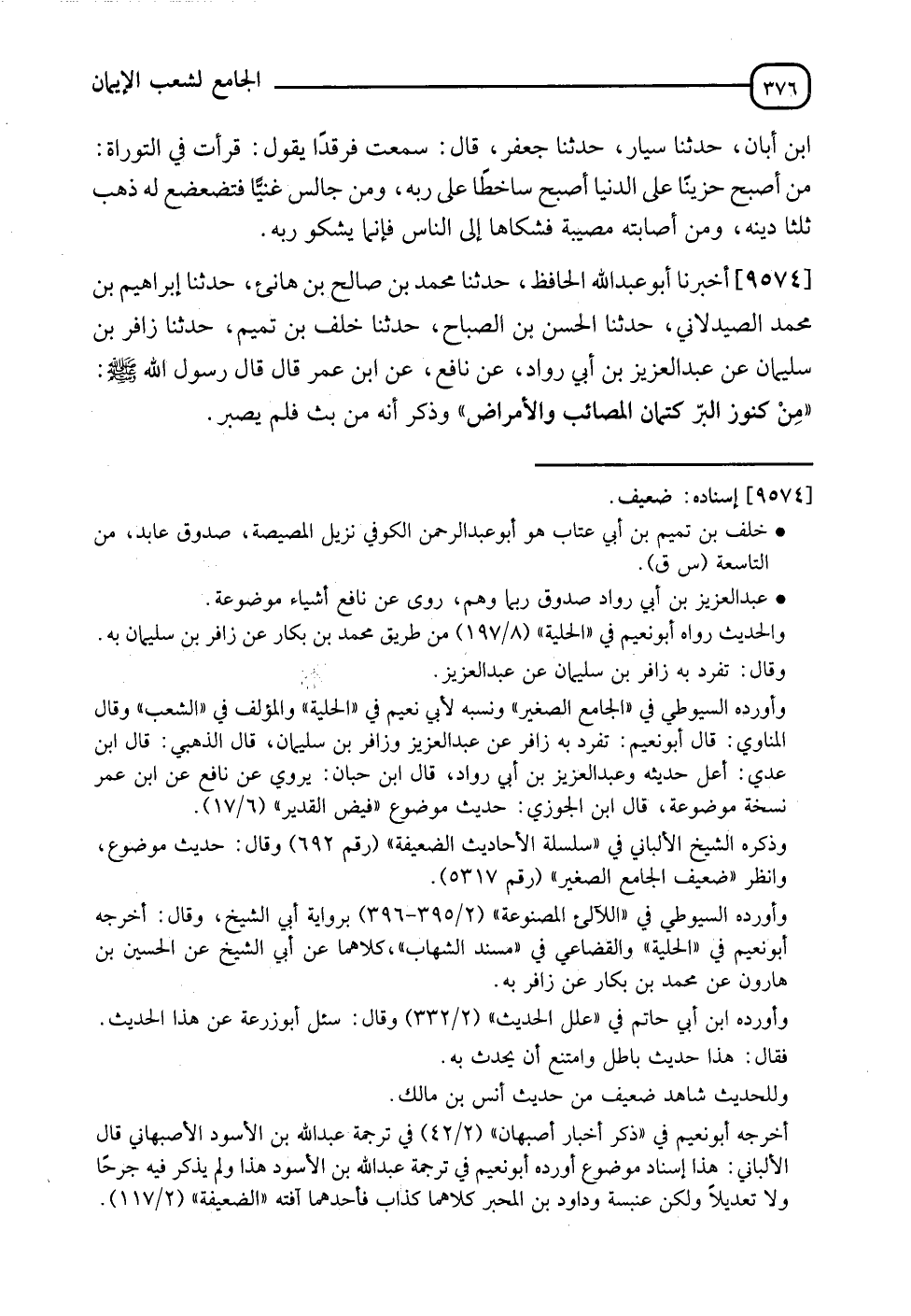 9574 - أَخْبَرَنَا أَبُو عَبْدِ اللهِ الْحَافِظُ , نَا مُحَمَّدُ بْنُ صَالِحِ بْنِ هَانِئٍ , نَا إِبْرَاهِيمُ بْنُ مُحَمَّدٍ الصَّيْدَلَانِيُّ , نَا الْحَسَنُ بْنُ الصَّبَّاحِ , نَا خَلَفُ بْنُ تَمِيمٍ , نَا زَافِرُ بْنُ سُلَيْمَانَ , عَنْ عَبْدِ الْعَزِيزِ بْنِ أَبِي رَوَّادٍ , عَنْ نَافِعٍ , عَنِ ابْنِ عُمَرَ , قَالَ: قَالَ رَسُولُ اللهِ صَلَّى اللَّهُ عَلَيْهِ وَسَلَّمَ: §" مِنْ كُنُوزِ الْبِرِّ كِتْمَانُ الْمَصَائِبِ , وَالْأَمْرَاضِ وَذَكَرَ أَنَّهُ مَنْ بَثَّ فَلَمْ يَصْبِرْ "