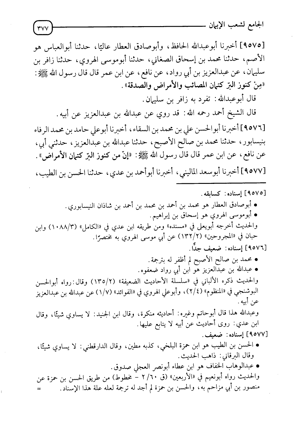 9575 - أَخْبَرَنَا أَبُو عَبْدِ اللهِ الْحَافِظُ , وَأَبُو صَادِقٍ الْعَطَّارُ عَالِيًا , نَا أَبُو الْعَبَّاسِ هُوَ الْأَصَمُّ , نَا مُحَمَّدُ هُوَ ابْنُ إِسْحَاقَ الصَّنْعَانِيُّ , نَا أَبُو مُوسَى الْهَرَوِيُّ , نَا زَافِرُ بْنُ سُلَيْمَانَ , عَنْ عَبْدِ الْعَزِيزِ بْنِ أَبِي رَوَّادٍ , عَنْ نَافِعٍ , عَنِ ابْنِ عُمَرَ , قَالَ: قَالَ رَسُولُ اللهِ صَلَّى اللَّهُ عَلَيْهِ وَسَلَّمَ: §" مِنْ كُنُوزِ الْبِرِّ كِتْمَانُ الْمَصَائِبِ , وَالْأَمْرَاضِ , وَالصَّدَقَةُ ". قَالَ أَبُو عَبْدِ اللهِ: " تَفَرَّدَ بِهِ زَافِرُ بْنُ سُلَيْمَانَ ". قَالَ الشَّيْخُ أَحْمَدُ رَحِمَهُ اللهُ: قَدْ رُوِيَ عَنْ عَبْدِ اللهِ بْنِ عَبْدِ الْعَزِيزِ , عَنْ أَبِيهِ