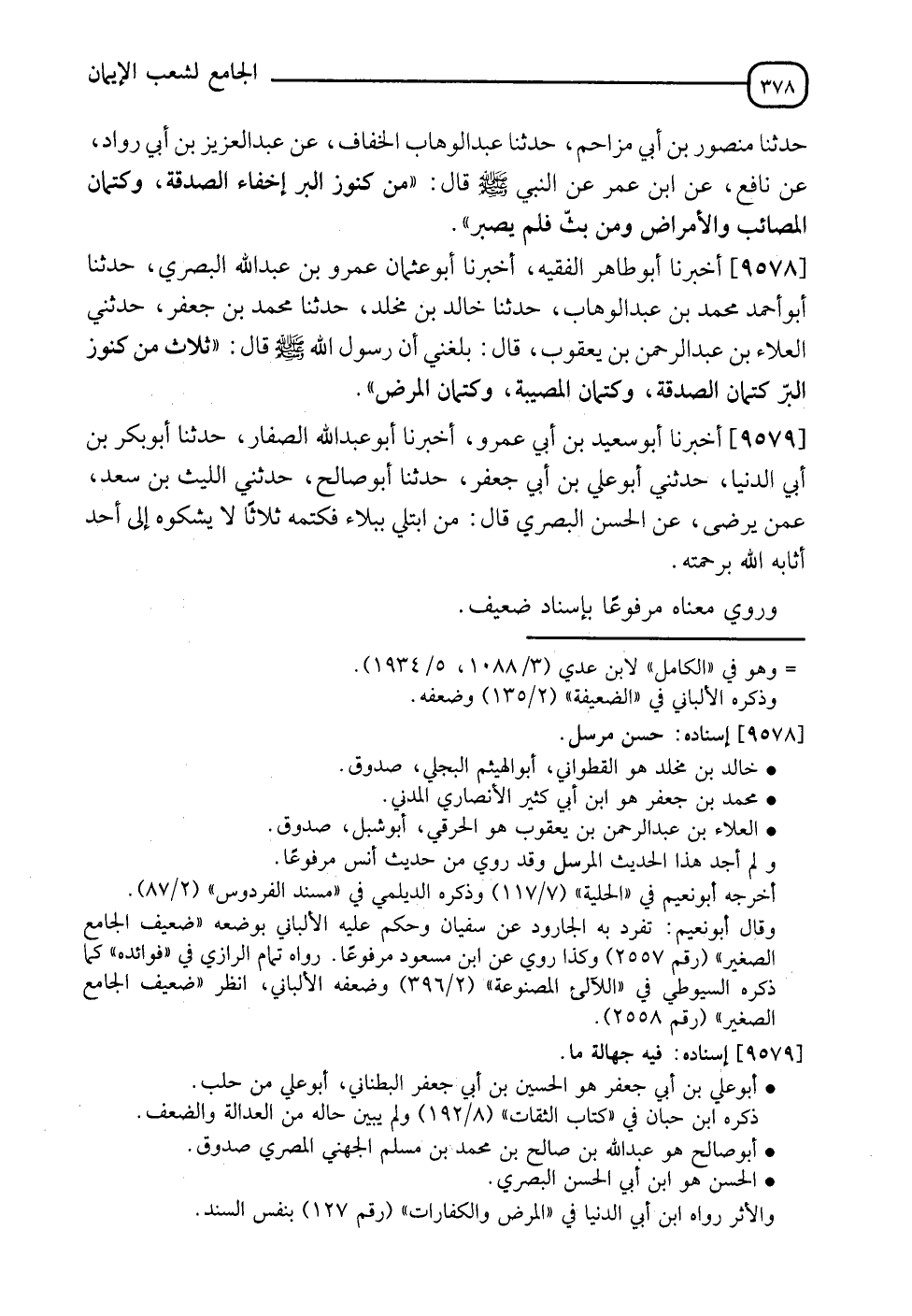 9578 - أَخْبَرَنَا أَبُو طَاهِرٍ الْفَقِيهُ , أَنَا أَبُو عُثْمَانٍ عَمْرُو بْنُ عَبْدِ اللهِ الْبَصْرِيُّ , نَا أَبُو أَحْمَدَ مُحَمَّدُ بْنُ عَبْدِ الْوَهَّابِ , أَنَا خَالِدُ بْنُ مَخْلَدٍ , نَا مُحَمَّدُ بْنُ جَعْفَرٍ , حَدَّثَنِي الْعَلَاءُ بْنُ عَبْدِ الرَّحْمَنِ بْنِ يَعْقُوبَ , قَالَ: بَلَغَنِي أَنَّ رَسُولَ اللهِ صَلَّى اللَّهُ عَلَيْهِ وَسَلَّمَ قَالَ: " §ثَلَاثٌ مِنْ كُنُوزِ الْبِرِّ: كِتْمَانُ الصَّدَقَةِ , وَكِتْمَانُ الْمُصِيبَةِ , وَكِتْمَانُ الْمَرَضِ "
