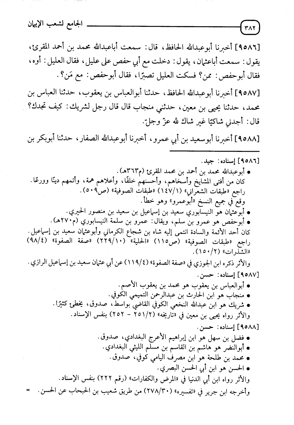 9587 - أَخْبَرَنَا أَبُو عَبْدِ اللهِ الْحَافِظُ , نَا أَبُو الْعَبَّاسِ بْنُ يَعْقُوبَ , نَا الْعَبَّاسُ بْنُ مُحَمَّدٍ , نَا يَحْيَى بْنُ مَعِينٍ , حَدَّثَنِي مِنْجَابٌ , قَالَ رَجُلٌ لِشَرِيكٍ: كَيْفَ تَجِدُكَ؟ قَالَ: §" أَجِدُنِي شَاكِيًا غَيْرَ شَاكِرٍ لِلَّهِ عَزَّ وَجَلَّ "