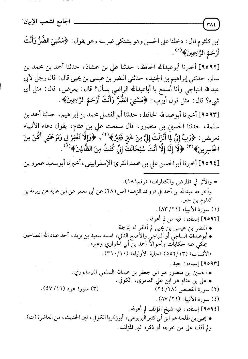 9592 - أَخْبَرَنَا أَبُو عَبْدِ اللهِ الْحَافِظُ , نَا عَلِيُّ بْنُ حَمْشَاذَ , نَا أَحْمَدُ بْنُ مُحَمَّدِ بْنِ سَالِمٍ , حَدَّثَنِي إِبْرَاهِيمُ بْنُ الْجُنَيْدِ , حَدَّثَنِي النَّضْرُ بْنُ عِيسَى بْنِ يَحْيَى , قَالَ: قَالَ رَجُلٌ لِأَبِي عَبْدِ اللهِ السَّاجِيُّ وَأَنَا أَسْمَعُ: يَا أَبَا عَبْدِ اللهِ , الرَّاضِي يَسْأَلُ؟ قَالَ: " يُعَرِّضُ " , قَالَ: مِثْلُ أَيِّ شَيْءٍ؟ قَالَ: " §مِثْلُ قَوْلِ أَيُّوبَ {مَسَّنِيَ الضُّرُّ وَأَنْتَ أَرْحَمُ الرَّاحِمِينَ} [الأنبياء: 83] "
