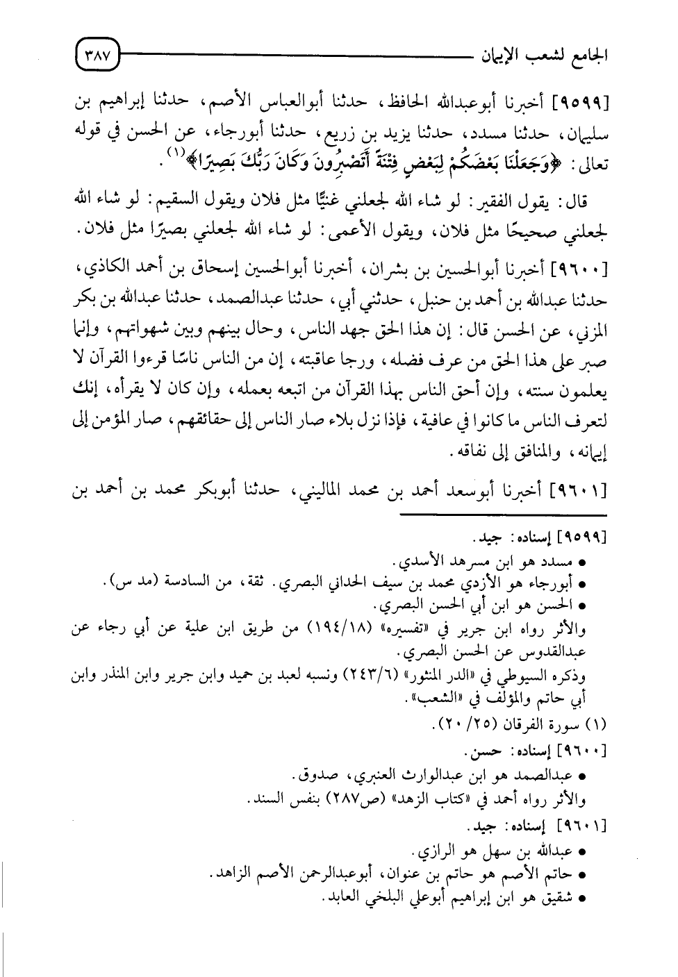 9599 - أَخْبَرَنَا أَبُو عَبْدِ اللهِ الْحَافِظُ , نَا أَبُو الْعَبَّاسِ هُوَ الْأَصَمُّ , نَا إِبْرَاهِيمُ بْنُ سُلَيْمَانَ , نَا مُسَدَّدٌ , نَا يَزِيدُ بْنُ زُرَيْعٍ , نَا أَبُو رَجَاءٍ , عَنِ الْحَسَنِ , فِي قَوْلِهِ تَعَالَى: {وَجَعَلْنَا بَعْضَكُمْ لِبَعْضٍ فِتْنَةً أَتَصْبِرُونَ وَكَانَ رَبُّكَ بَصِيرًا} [الفرقان: 20] قَالَ: " §يَقُولُ الْفَقِيرُ: لَوْ شَاءَ اللهُ لَجَعَلَنِي غَنِيًّا مِثْلَ فُلَانٍ. وَيَقُولُ السَّقِيمُ: لَوْ شَاءَ اللهُ لَجَعَلَنِي صَحِيحًا مِثْلَ فُلَانٍ. يَقُولُ الْأَعْمَى: لَوْ شَاءَ اللهُ لَجَعَلَنِي بَصِيرًا مِثْلَ فُلَانٍ "