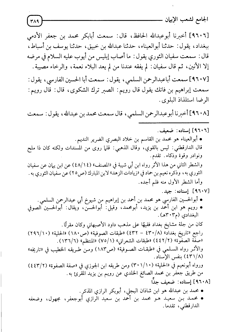 9606 - أَخْبَرَنَا أَبُو عَبْدِ اللهِ الْحَافِظُ , قَالَ: سَمِعْتُ أَبَا بَكْرٍ مُحَمَّدَ بْنَ جَعْفَرٍ الْأَدَمِيُّ , بِبَغْدَادَ , يَقُولُ: نَا أَبُو الْعَيْنَاءَ , نَا عَبْدُ اللهِ بْنُ خُبَيْقٍ , نَا يُوسُفُ بْنُ أَسْبَاطٌ , قَالَ: سَمِعْتُ سُفْيَانَ الثَّوْرِيِّ , يَقُولُ: §" مَا أَصَابَ إِبْلِيسُ مِنْ أَيُّوبَ عَلَيْهِ السَّلَامُ فِي مَرَضِهِ إِلَّا الْأَنِينَ ". ثُمَّ قَالَ سُفْيَانُ: " لَمْ يَفْقَهْ عِنْدَنَا مَنْ لَمْ يَعُدَّ الْبَلَاءَ نِعْمَةً , وَالرَّخَاءَ مُصِيبَةً "