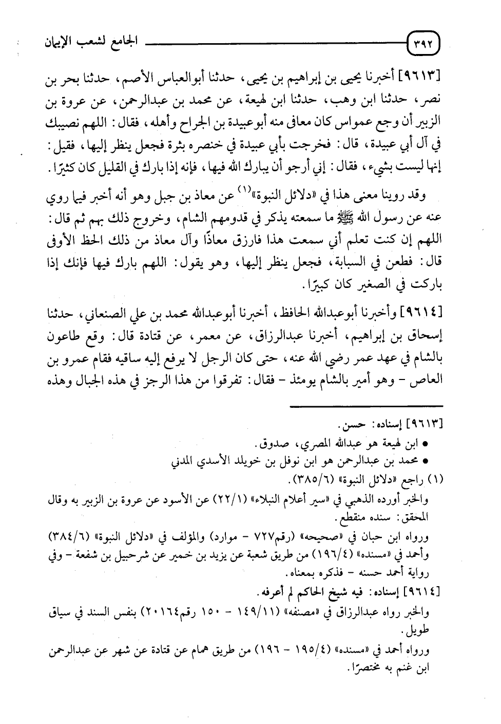 9613 - أَخْبَرَنَا يَحْيَى بْنُ إِبْرَاهِيمَ بْنِ يَحْيَى , نَا أَبُو الْعَبَّاسِ الْأَصَمُّ , نَا بَحْرُ بْنُ نَصْرٍ , نَا ابْنُ وَهْبٍ , نَا ابْنُ لَهِيعَةَ , عَنْ مُحَمَّدِ بْنِ عَبْدِ الرَّحْمَنِ , عَنْ عَوْرَةَ بْنِ الزُّبَيْرِ , أَنَّ وَجَعَ عَمْوَاسٍ كَانَ مُعَافًى مِنْهُ أَبُو عُبَيْدِ بْنِ الْجَرَّاحِ وَأَهْلُهُ , فَقَالَ: " اللهُمَّ نَصِيبَكَ فِي آلِ أَبِي عُبَيْدَةَ. قَالَ: فَخَرَجَتْ بِأَبِي عُبَيْدَةَ فِي خَصْرِهِ بَثْرَةٌ فَجَعَلَ يَنْظُرُ إِلَيْهَا فَقِيلَ: " إِنَّهَا لَيْسَتْ بِشَيْءٍ " فَقَالَ: " إِنِّي أَرْجُو أَنْ يُبَارِكَ اللهُ فِيهَا , فَإِنَّهُ §إِذَا بَارَكَ فِي الْقَلِيلِ كَانَ كَثِيرًا "