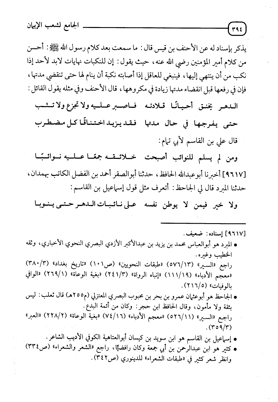 9617 - أَخْبَرَنَا أَبُو عَبْدِ اللهِ الْحَافِظُ , نَا أَبُو الصقرِ أَحْمَدُ بْنُ الْفَضْلِ الْكَاتِبُ بِهَمَذَانَ , نَا الْمُبَرِّدُ , قَالَ لِيَ الْجَاحِظُ: أَتَعْرِفُ مِثْلَ قَوْلِ إِسْمَاعِيلَ بْنِ الْقَاسِمِ: