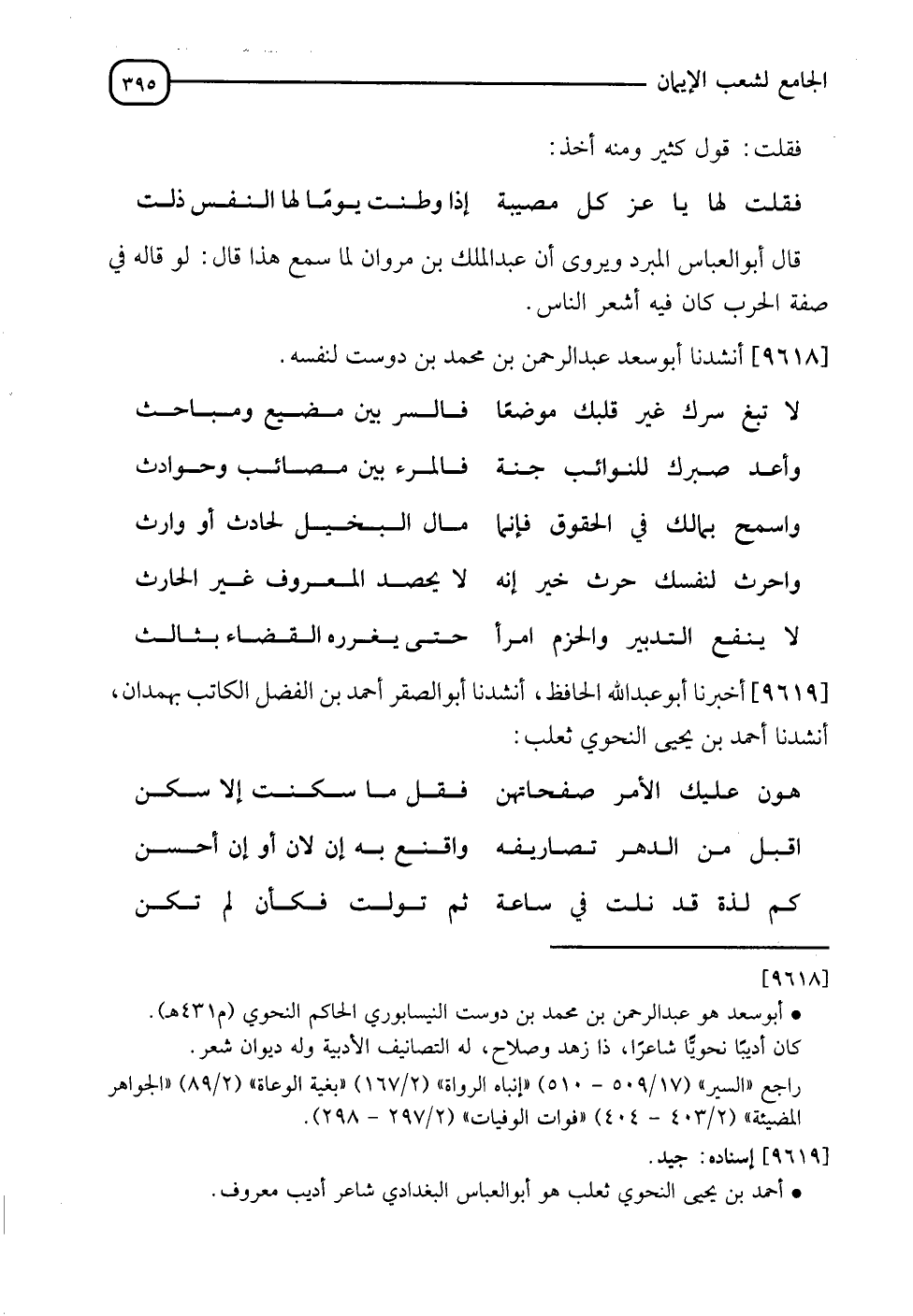 9619 - أَخْبَرَنَا أَبُو عَبْدِ اللهِ الْحَافِظُ , أَنْشَدَنَا أَبُو الصقرِ أَحْمَدُ بْنُ الْفَضْلِ الْكَاتِبُ بِهَمْدَانَ , أَنْشَدَنَا أَحْمَدُ بْنُ يَحْيَى النَّحْوِيُّ ثَعْلَبٌ: