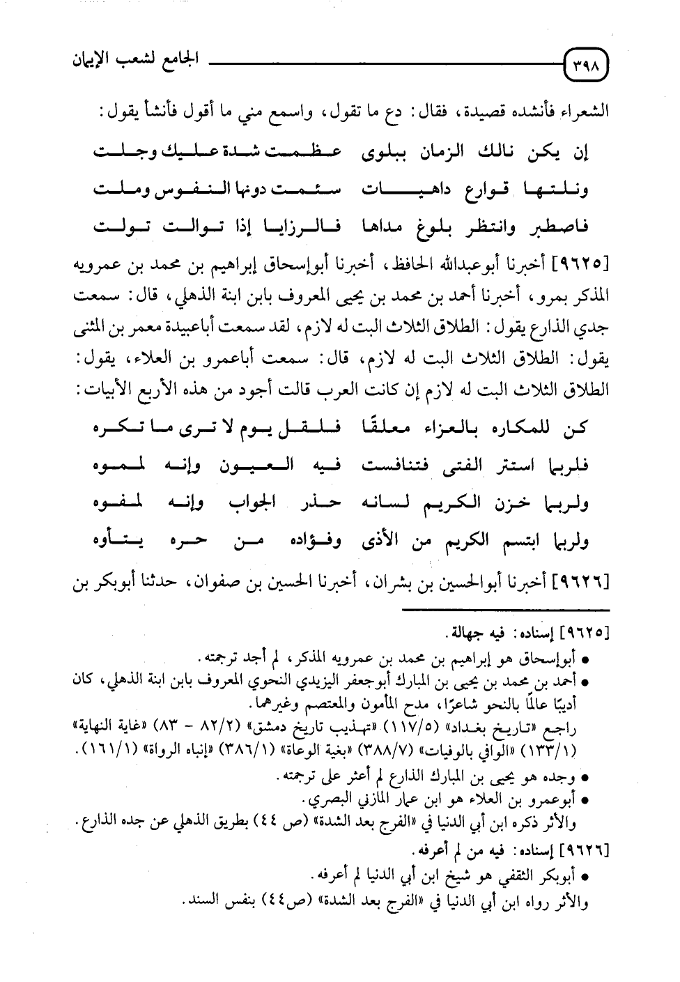 9625 - أَخْبَرَنَا أَبُو عَبْدِ اللهِ الْحَافِظُ , أَنَا أَبُو إِسْحَاقَ إِبْرَاهِيمُ بْنُ مُحَمَّدِ بْنِ عَمْرَوَيْهِ الْمُذَكِّرُ بِمَرْوٍ , أَنَا أَحْمَدُ بْنُ مُحَمَّدِ بْنِ يَحْيَى الْمَعْرُوفُ بِابْنِ ابْنَةِ الذُّهْلِيِّ , قَالَ: سَمِعْتُ جَدِّي الذَّارِعَ , يَقُولُ:" §الطَّلَاقُ الثَّلَاثُ الْبَتُّ لَهُ لَازِمٌ". لَقَدْ سَمِعْتُ أَبَا عُبَيْدَةَ مَعْمَرَ بْنَ الْمُثَنَّى , يَقُولُ:" الطَّلَاقُ الثَّلَاثُ الْبَتُّ لَهُ لَازِمٌ". قَالَ: سَمِعْتُ أَبَا عَمْرِو بْنِ الْعَلَاءِ , يَقُولُ:" الطَّلَاقُ الثَّلَاثُ الْبَتُّ لَهُ لَازِمٌ , إِنْ كَانَتِ الْعَرَبُ قَالَتْ أَجْوَدَ مِنْ هَذِهِ الْأَرْبَعِ الْأَبْيَاتِ: