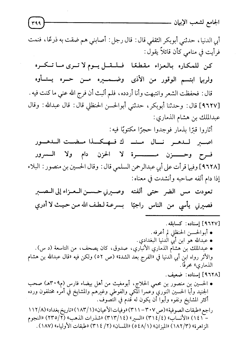 9628 - وَفِيمَا قَرَأْتُ عَلَى أَبِي عَبْدِ الرَّحْمَنِ السُّلَمِيِّ , قَالَ: وَقَالَ الْحُسَيْنُ بْنُ مَنْصُورٍ: الْبَلَاءُ إِذَا دَامَ أَلِفَهُ صَاحِبُهُ وأَنْشَدْتُ فِي مَعْنَاهُ: