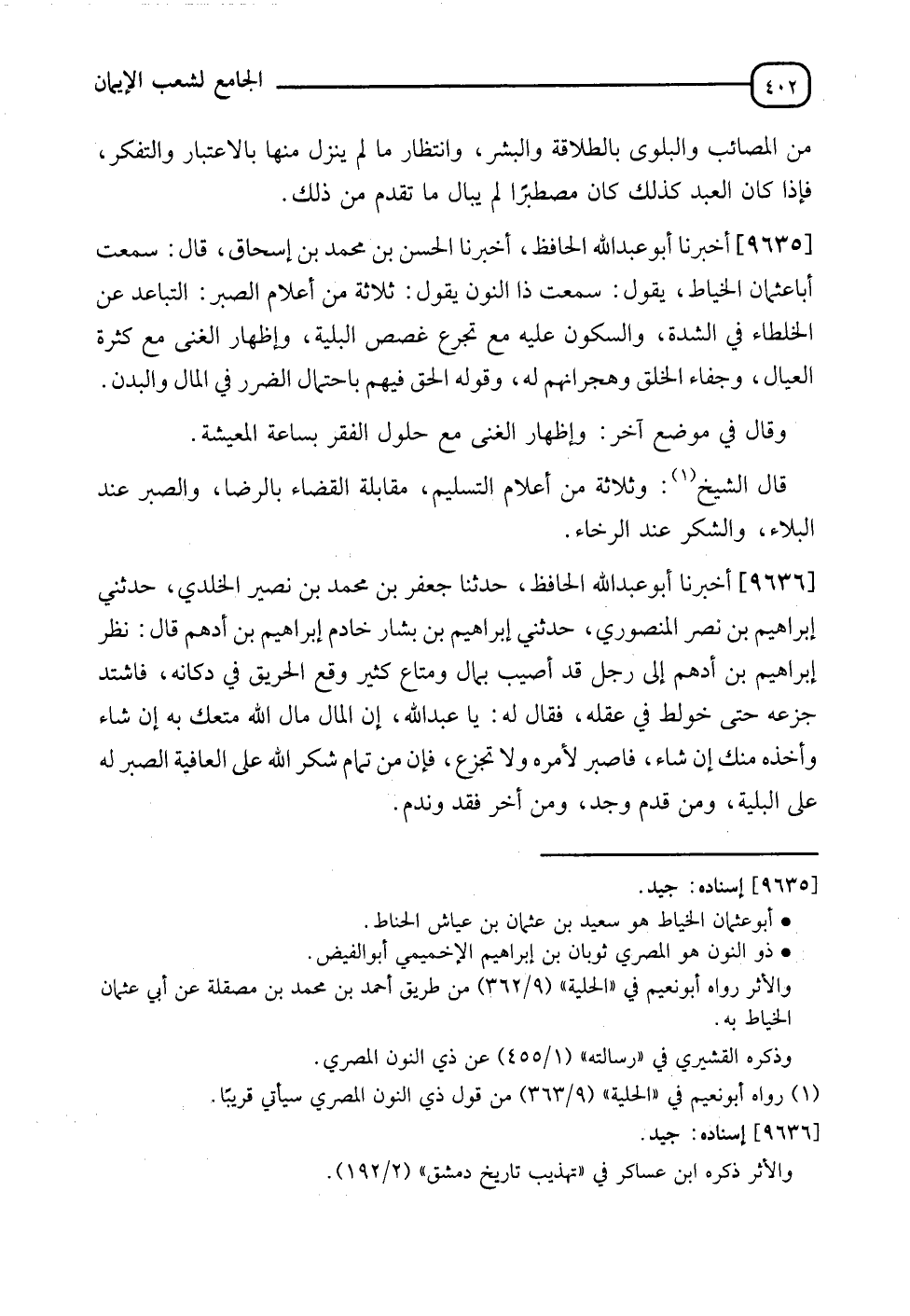 9635 - أَخْبَرَنَا أَبُو عَبْدِ اللهِ الْحَافِظُ , أَنَا الْحَسَنُ بْنُ مُحَمَّدِ بْنِ إِسْحَاقَ , قَالَ: سَمِعْتُ أَبَا عُثْمَانَ الْخَيَّاطَ , يَقُولُ: سَمِعْتُ ذَا النُّونِ , يَقُولُ: " §ثَلَاثَةٌ مِنْ أَعْلَامِ الصَّبْرِ: التَّبَاعُدُ عَنِ الْخُلَطَاءِ فِي الشِّدَّةِ , وَالسُّكُونُ عَلَيْهِ مَعَ تَجَرُّعِ غَصَصِ الْبَلِيَّةِ , وَإِظْهَارُ الْغِنَى مَعَ كَثْرَةِ الْعِيَالِ وَجَفَاءِ الْخَلْقِ وَهُجْرَانُهُمْ لَهُ , وَقَوْلُهُ الْحَقَّ فِيهِمْ بِاحْتِمَالِ الضَّرَرِ فِي الْمَالِ وَالْبُدْنِ " , وَقَالَ فِي مَوْضِعٍ آخَرَ: " وَإِظْهَارُ الْغِنَى مَعَ حُلُولِ الْفَقْرِ بِسَاحَةِ الْمَعِيشَةِ ". قَالَ الشَّيْخُ: " وَثَلَاثَةٌ مِنْ أَعْلَامِ التَّسْلِيمِ: مُقَابَلَةُ الْقَضَاءِ بِالرِّضَا , وَالصَّبْرُ عِنْدِ الْبَلَاءِ , وَالشُّكْرُ عِنْدَ الرَّخَاءِ "