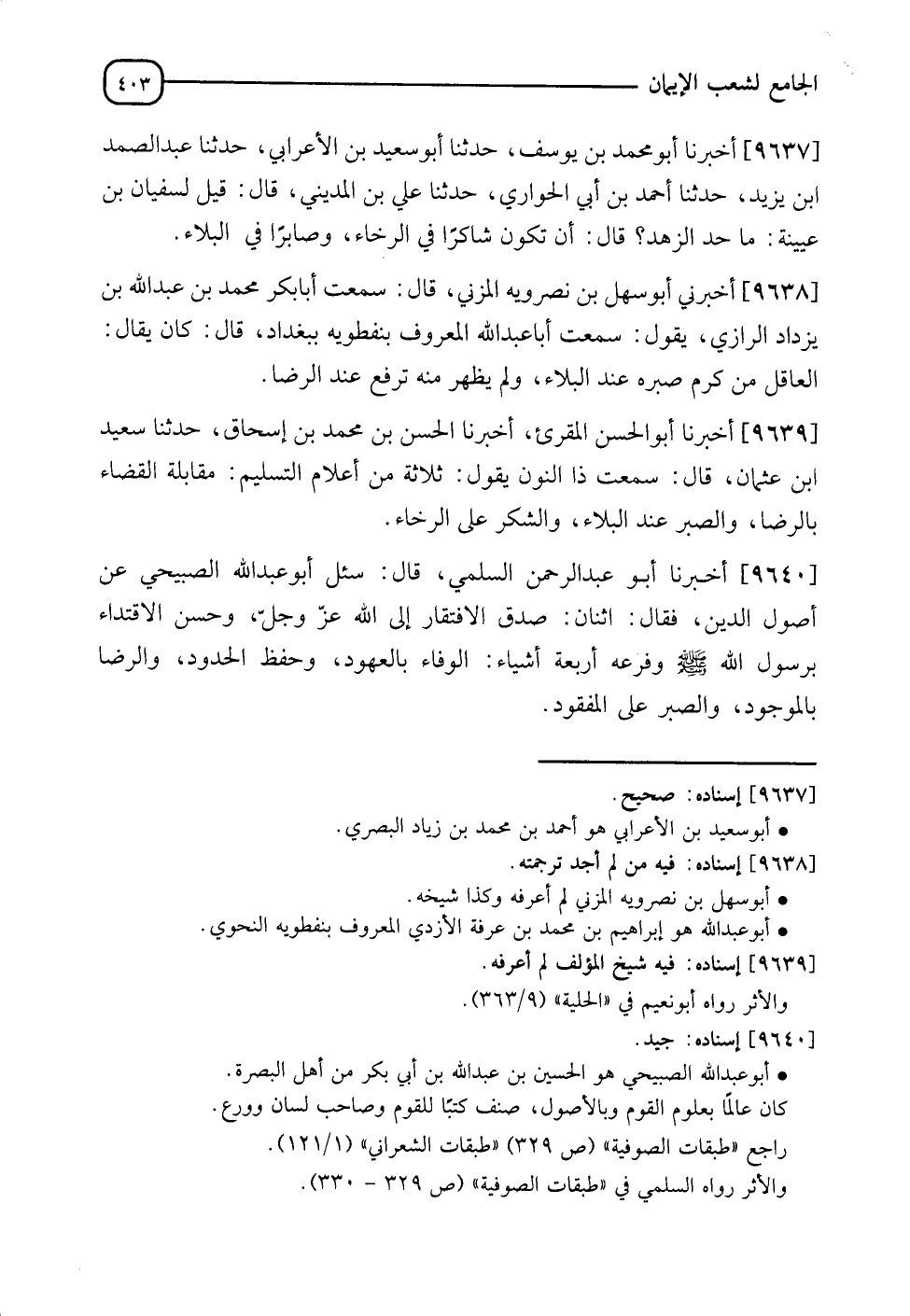9640 - أَخْبَرَنَا أَبُو عَبْدِ الرَّحْمَنِ السُّلَمِيُّ , قَالَ: سُئِلَ أَبُو عَبْدِ اللهِ الصَّبِيحِيُّ , عَنْ أُصُولِ الدِّينِ , فَقَالَ: " §اثْنَانِ: صِدْقُ الِافْتِقَارِ إِلَى اللهِ عَزَّ وَجَلَّ , وَحُسْنُ الِاقْتِدَاءِ بِرَسُولِ اللهِ صَلَّى اللَّهُ عَلَيْهِ وَسَلَّمَ , وَفَرْعُهُ أَرْبَعَةُ أَشْيَاءَ: الْوَفَاءُ بِالْعُهُودِ , وَحِفْظُ الْحُدُودِ , وَالرِّضَا بِالْمَوْجُودِ , وَالصَّبْرُ عَلَى الْمَفْقُودِ "