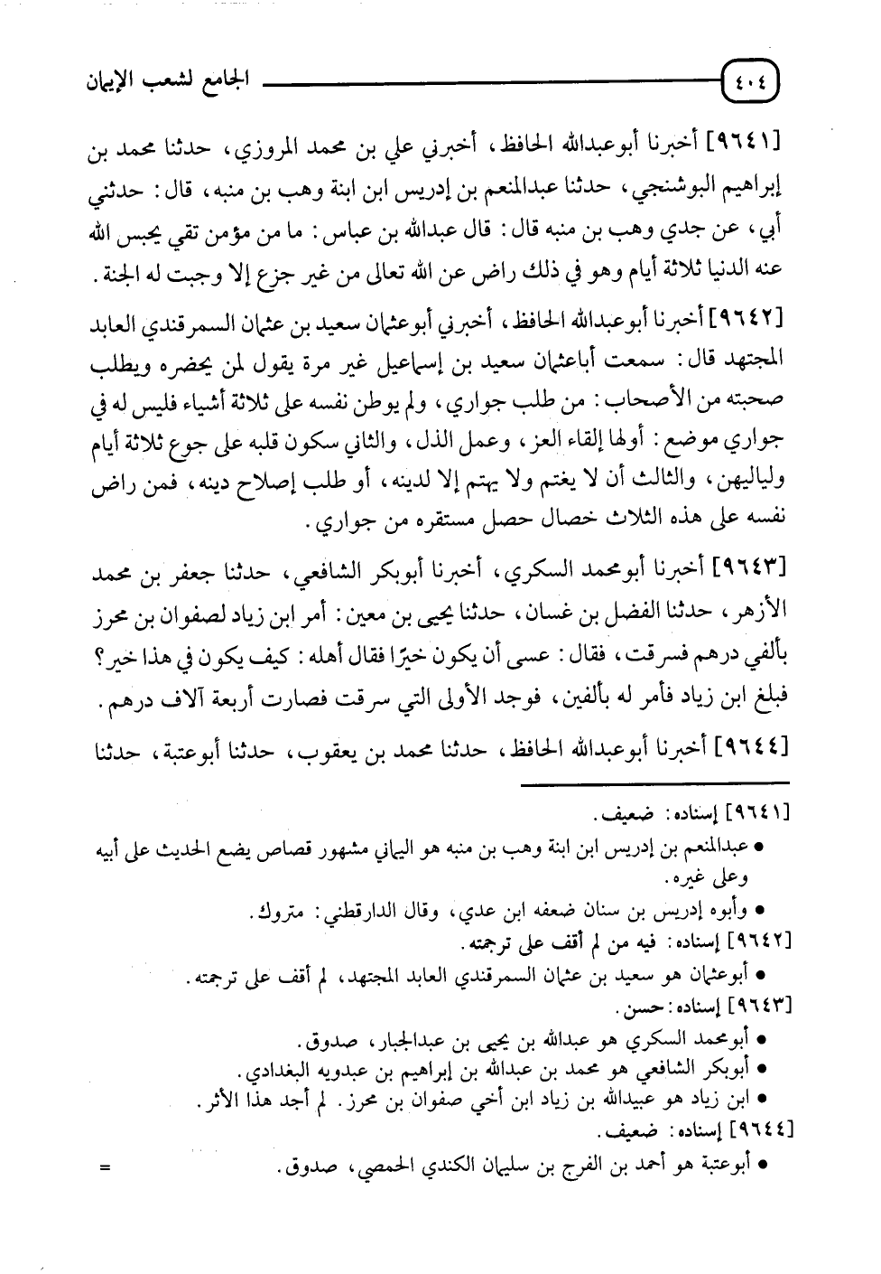 9641 - وَأَخْبَرَنَا أَبُو عَبْدِ اللهِ الْحَافِظُ , أَخْبَرَنِي عَلِيُّ بْنُ مُحَمَّدٍ الْمَرْوَزِيُّ , نَا مُحَمَّدُ بْنُ إِبْرَاهِيمَ الْبُوشَنْجِيُّ , نَا عَبْدُ الْمُنْعِمِ بْنُ إِدْرِيسَ ابْنُ ابْنَةِ وَهْبِ بْنِ مُنَبِّهٍ , قَالَ: حَدَّثَنِي أَبِي , عَنْ جَدِّي وَهْبِ بْنِ مُنَبِّهٍ قَالَ: قَالَ عَبْدُ اللهِ بْنُ عَبَّاسٍ: §" مَا مِنْ مُؤْمِنٍ تَقِيٍّ يَحْبِسُ اللهُ عَنْهُ الدُّنْيَا ثَلَاثَةَ أَيَّامٍ وَهُوَ فِي ذَلِكَ رَاضٍ عَنِ اللهِ تَعَالَى مِنْ غَيْرِ جَزَعٍ إِلَّا وَجَبَتْ لَهُ الْجَنَّةُ "