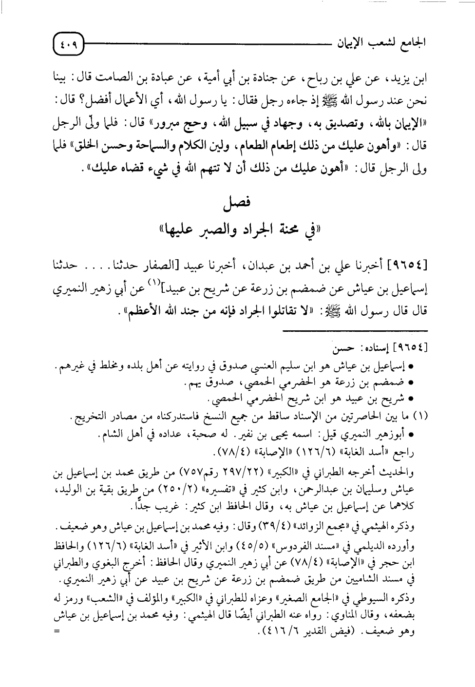 9654 - أَخْبَرَنَا عَلِيُّ بْنُ أَحْمَدَ بْنِ عَبْدَانَ , أَنَا أَحْمَدُ بْنُ عُبَيْدٍ , عَنْ أَبِي زُهَيْرٍ النُّمَيْرِيِّ , قَالَ: قَالَ رَسُولُ اللهِ صَلَّى اللَّهُ عَلَيْهِ وَسَلَّمَ: §" لَا تَقْتُلُوا الْجَرَادَ فَإِنَّهُ مِنْ جُنْدِ اللهِ الْأَعْظَمِ ". -[410]-