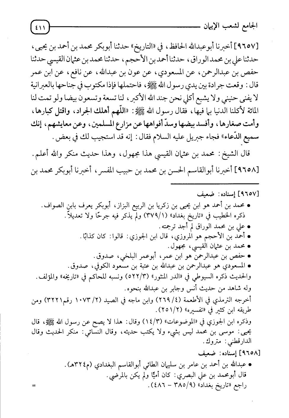 9657 - أَخْبَرَنَا أَبُو عَبْدِ اللهِ الْحَافِظُ , فِي التَّارِيخِ , نَا أَبُو بَكْرٍ مُحَمَّدُ بْنُ أَحْمَدَ بْنِ يَحْيَى , نَا عَلِيُّ بْنُ مُحَمَّدٍ الْوَرَّاقُ , نَا أَحْمَدُ بْنُ الْأَحْجَمِ , نَا مُحَمَّدُ بْنُ عُثْمَانَ الْقَيْسِيُّ , نَا حَفْصُ بْنُ عَبْدِ الرَّحْمَنِ , عَنِ الْمَسْعُودِيِّ , عَنْ عَوْنِ بْنِ عَبْدِ اللهِ , عَنْ نَافِعٍ , عَنِ ابْنِ عُمَرَ , قَالَ: وَقَعَتْ جَرَادَةٌ بَيْنَ يَدَيْ رَسُولِ اللهِ صَلَّى اللَّهُ عَلَيْهِ وَسَلَّمَ فَاحْتَمَلَهَا فَإِذَا مَكْتُوبٌ فِي جَنَاحِهَا بِالْعِبْرَانِيَّةِ: لَا يُغْنِي حَنِينِي , وَلَا يَشْبَعُ آكِلِي , نَحْنُ جُنْدُ اللهِ الْأَكْبَرُ , لَنَا تِسْعَةٌ وَتِسْعُونَ بِيضًا , وَلَوْ تَمَّتْ لَنَا الْمِائَةُ لَأَكَلْنَا الدُّنْيَا بِمَا فِيهَا , فَقَالَ رَسُولُ اللهِ صَلَّى اللَّهُ عَلَيْهِ وَسَلَّمَ: §" اللهُمَّ أَهْلِكِ الْجَرَادَ , اقْتُلْ كِبَارَهَا , وَأَمِتْ صِغَارَهَا , وَأَفْسِدْ بَيْضَهَا , وُسُدَّ أَفْوَاهَهَا عَنْ مَزَارِعِ الْمُسْلِمِينَ , وَعَنْ مَعَايِشِهُمْ إِنَّكَ سَمِيعُ الدُّعَاءِ " فَجَاءَهُ جِبْرِيلُ عَلَيْهِ السَّلَامُ فَقَالَ: إِنَّهُ قَدِ اسْتُجِيبَ لَكَ فِي بَعْضٍ. قَالَ الشَّيْخُ مُحَمَّدُ بْنُ عُثْمَانَ الْقَيْسِيُّ: " هَذَا مَجْهُولٌ وَهَذَا حَدِيثٌ مُنْكَرٌ , وَاللهُ أَعْلَمُ "