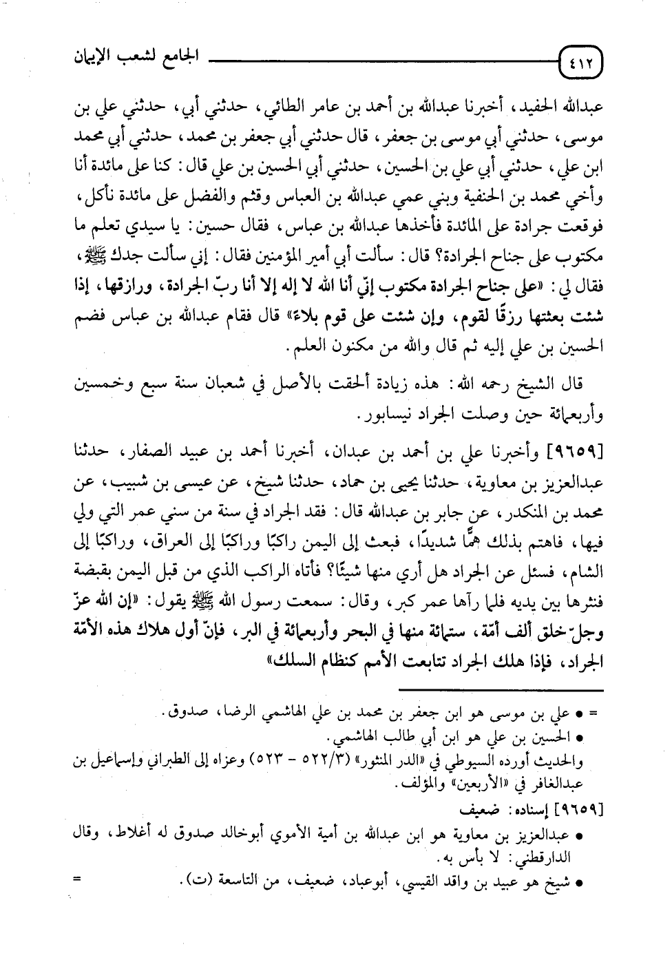 9659 - وَأَخْبَرَنَا عَلِيُّ بْنُ أَحْمَدَ بْنِ عَبْدَانَ , أَنَا أَحْمَدُ بْنُ عُبَيْدٍ الصَّفَّارِ , نَا عَبْدُ الْعَزِيزِ بْنُ مُعَاوِيَةَ , نَا يَحْيَى بْنُ حَمَّادٍ , نَا شَيْخٌ , عَنْ عِيسَى بْنِ شَبِيبٍ , عَنْ مُحَمَّدِ بْنِ الْمُنْكَدِرِ , عَنْ جَابِرِ بْنِ عَبْدِ اللهِ , قَالَ: فُقِدَ الْجَرَادُ فِي سَنَةٍ مِنْ سِنِيِّ عُمَرَ الَّتِي وُلِّيَ فِيهَا فَاهْتَمَّ بِذَلِكَ هَمًّا شَدِيدًا فَبَعَثَ إِلَى الْيَمَنِ رَاكِبًا وَرَاكِبًا إِلَى الْعِرَاقِ , وَرَاكِبًا إِلَى الشَّامِ , فَسَأَلَ عَنِ الْجَرَادِ هَلْ رُئِيَ مِنْهُ شَيْءٌ؟ فَأَتَاهُ الرَّاكِبُ الَّذِي مِنْ قِبَلِ الْيَمَنِ بِقَبْضَةٍ فَنَثَرَهَا بَيْنَ يَدَيْهِ , فَلَمَّا رَآهَا عُمَرُ كَبَّرَ , وَقَالَ: سَمِعْتُ رَسُولَ اللهِ صَلَّى اللَّهُ عَلَيْهِ وَسَلَّمَ يَقُولُ: " إِنَّ §اللهَ عَزَّ وَجَلَّ خَلَقَ أَلْفَ أُمَّةٍ سِتَّمِائَةً مِنْهَا فِي الْبَحْرِ , وَأَرْبَعَمِائَةٍ فِي الْبِرِّ , فَإِنَّ أَوَّلَ هَلَاكِ هَذِهِ الْأُمَّةِ الْجَرَادُ , فَإِذَا هَلَكَ الْجَرَادُ تَتَابَعَتِ الْأُمَمُ كَنِظَامِ السِّلْكِ ". -[413]-
