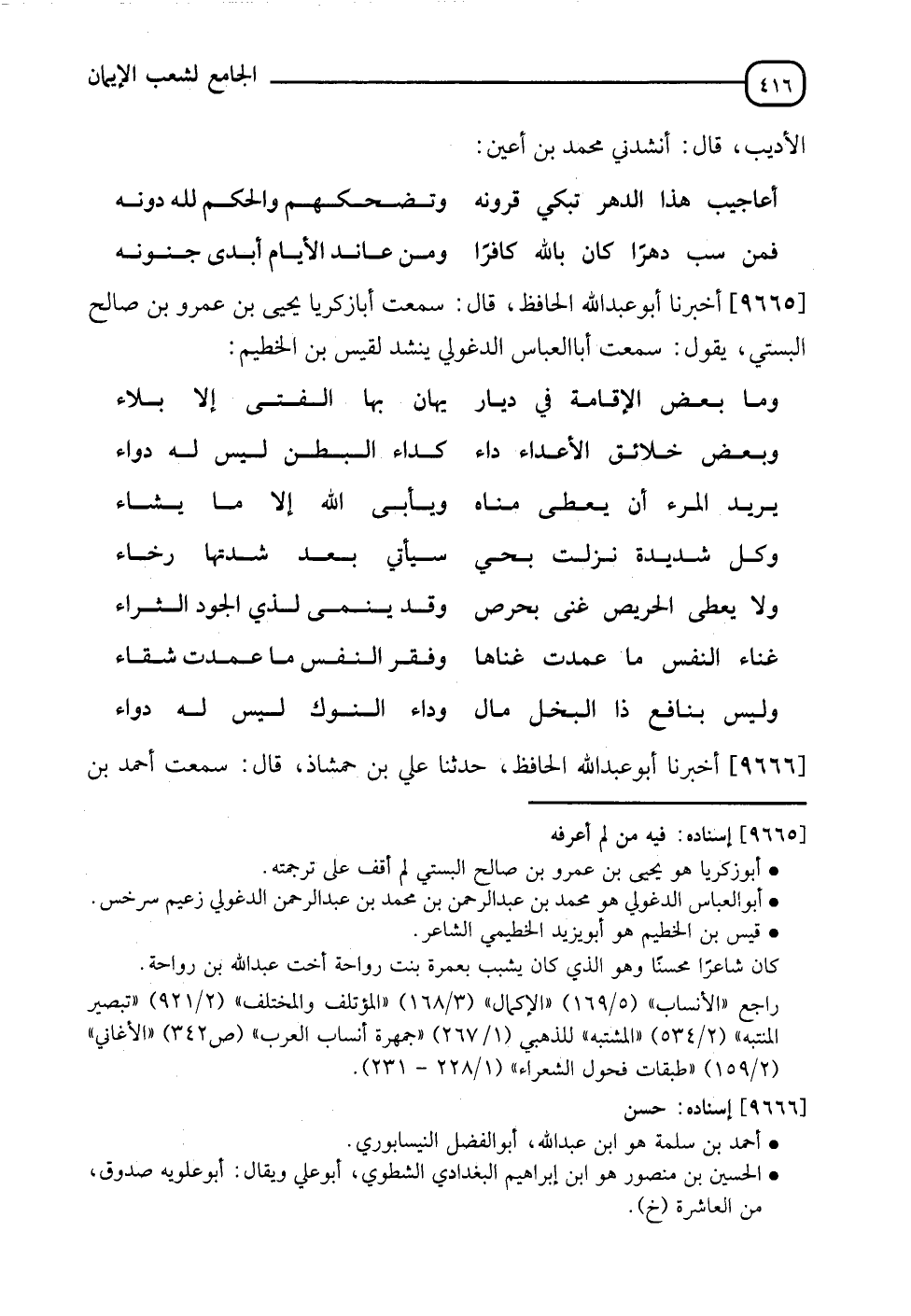 9665 - أَخْبَرَنَا أَبُو عَبْدِ اللهِ الْحَافِظُ , قَالَ: سَمِعْتُ أَبَا زَكَرِيَّا يَحْيَى بْنَ عَمْرِو بْنِ صَالِحٍ الْبُسْتِيُّ , يَقُولُ: سَمِعْتُ أَبَا الْعَبَّاسِ الدَّغُولِيُّ , يُنْشِدُ لِقَيْسِ بْنِ الْخُطَيْمِ