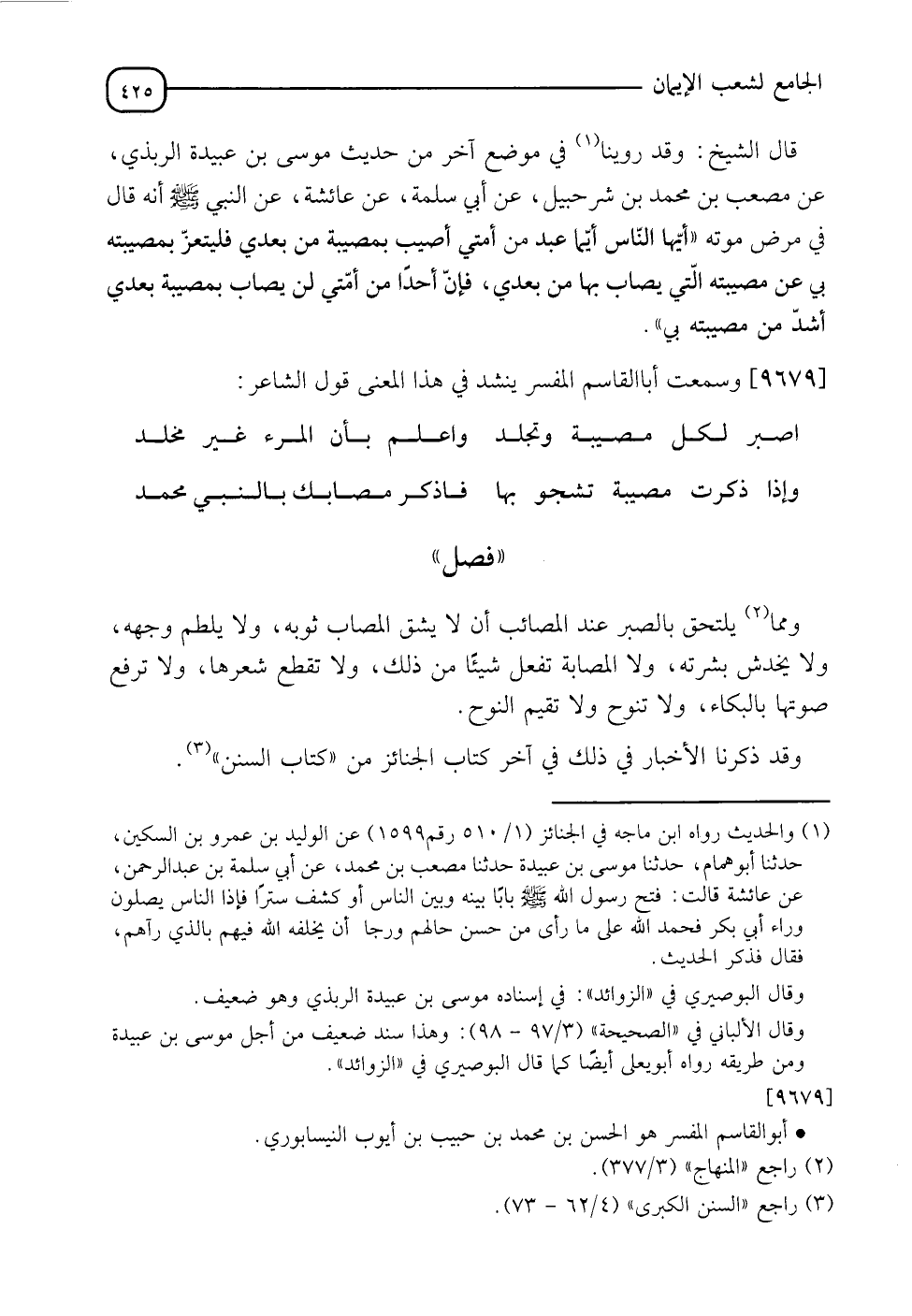 قَالَ الشَّيْخُ: وَقَدْ رُوِّينَا فِي مَوْضِعٍ آخَرَ مِنْ حَدِيثِ مُوسَى بْنِ عُبَيْدَةَ الرَّبَذِيِّ , عَنْ مُصْعَبِ بْنِ مُحَمَّدِ بْنِ شُرَحْبِيلَ , عَنْ أَبِي سَلَمَةَ , عَنْ عَائِشَةَ , عَنِ النَّبِيِّ صَلَّى اللَّهُ عَلَيْهِ وَسَلَّمَ , أَنَّهُ قَالَ فِي مَرِضِ مَوْتِهِ: " أَيُّهَا النَّاسُ §أَيُّمَا عَبْدٍ مِنْ أُمَّتِي أُصِيبَ بِمُصِيبَةٍ مِنْ بَعْدِي فَلْيَتَعَزَّ بِمُصِيبَتِهِ بِي عَنْ مُصِيبَتِهِ الَّتِي يُصَابُ بِهَا مِنْ بَعْدِي , فَإِنَّ أَحَدًا مِنْ أُمَّتِي لَنْ يُصَابَ بِمُصِيبَةٍ بَعْدِي أَشَدَّ مِنْ مُصِيبَتِهِ بِي "