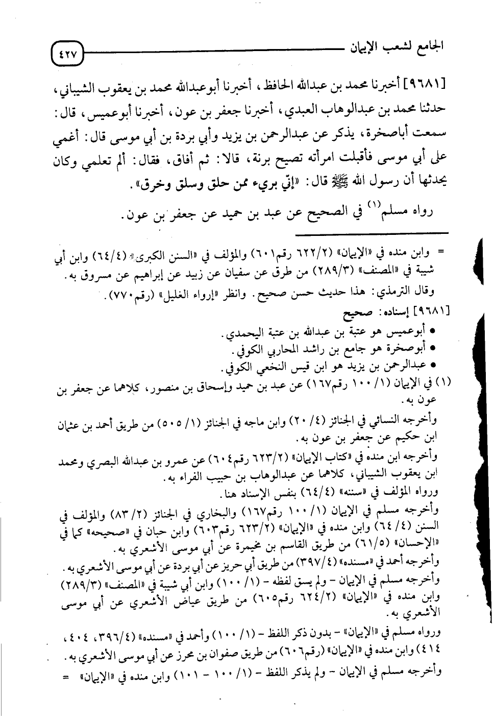 9681 - أَخْبَرَنَا مُحَمَّدُ بْنُ عَبْدِ اللهِ الْحَافِظُ , أَنَا أَبُو عَبْدِ اللهِ مُحَمَّدُ بْنُ يَعْقُوبَ الشَّيْبَانِيُّ , نَا مُحَمَّدُ بْنُ عَبْدِ الْوَهَّابِ الْعَبْدِيُّ , أَنَا جَعْفَرُ بْنُ عَوْنٍ , أَنَا أَبُو عُمَيْسٍ , قَالَ: سَمِعْتُ أَبَا صَخْرَةَ , يُذْكَرُ , عَنْ عَبْدِ الرَّحْمَنِ بْنِ يَزِيدَ , وَأَبِي بُرْدَةَ بْنِ أَبِي مُوسَى , قَالَ: أُغْمِيَ عَلَى أَبِي مُوسَى فَأَقْبَلَتِ امْرَأَتُهُ تَصِيحُ بِرَنَّةٍ , قَالَا: ثُمَّ أَفَاقَ فَقَالَ: أَلَمْ تَعْلَمِي , وَكَانَ يُحَدِّثُهَا عَنْ رَسُولُ اللهِ صَلَّى اللَّهُ عَلَيْهِ وَسَلَّمَ قَالَ: §" إِنِّي بَرِيءٌ مِمَّنْ حَلَقَ , وَسَلَقَ وَخَرَقَ ". رَوَاهُ مُسْلِمٌ فِي الصَّحِيحِ , عَنْ عَبْدِ بْنِ حُمَيْدٍ , عَنْ جَعْفَرِ بْنِ عَوْنٍ