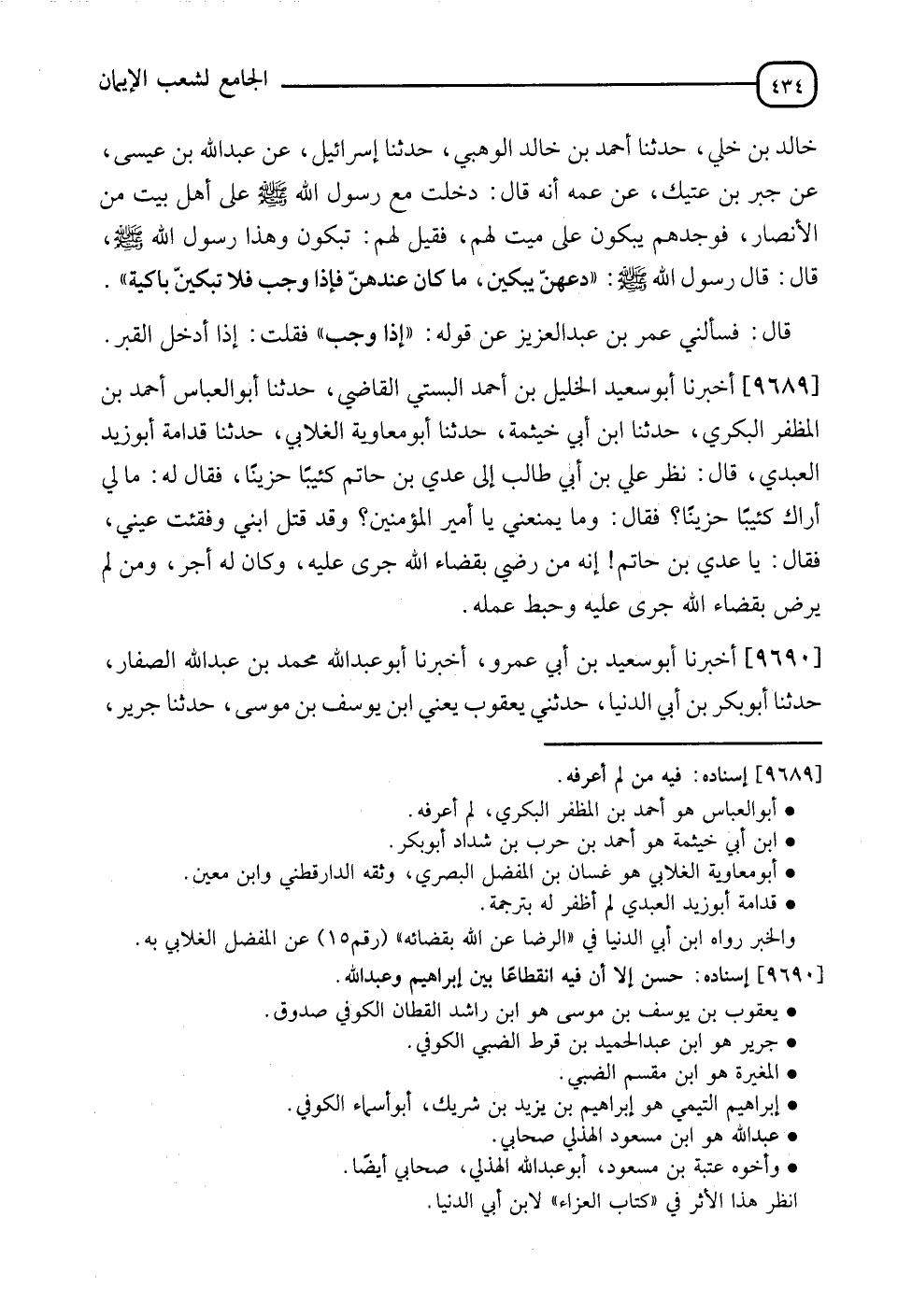 9689 - أَخْبَرَنَا أَبُو سَعِيدٍ الْخَلِيلُ بْنُ أَحْمَدَ الْبُسْتِيُّ الْقَاضِي , نَا أَبُو الْعَبَّاسِ أَحْمَدُ بْنُ الْمُظَفَّرِ الْبَكْرِيُّ , أَنَا ابْنُ أَبِي خَيْثَمَةَ , نَا أَبُو مُعَاوِيَةَ الْغلَّابِيُّ , نَا قُمَامَةَ أَبُو زَيْدٍ الْعَبْدِيُّ , قَالَ: نَظَرَ عَلِيُّ بْنُ أَبِي طَالِبٍ إِلَى عَدِيِّ بْنِ حَاتِمٍ كَئِيبًا حَزِينًا فَقَالَ لَهُ: " مَا لِي أَرَاكَ كَئِيبًا حَزِينًا؟ " فَقَالَ: وَمَا يَمْنَعُنِي يَا أَمِيرَ الْمُؤْمِنِينَ وَقَدْ قُتِلَ أَبِي , وَفُقِئَتْ عَيْنِي؟ فَقَالَ: " يَا عَدِيُّ بْنَ حَاتِمٍ , إِنَّهُ §مِنْ رَضِيَ بِقَضَاءِ اللهِ جَرَى عَلَيْهِ , وَكَانَ لَهُ أَجْرًا , وَمَنْ لَمْ يَرْضَ بِقَضَاءِ اللهِ جَرَى عَلَيْهِ , وَحَبِطَ عَمَلُهُ "