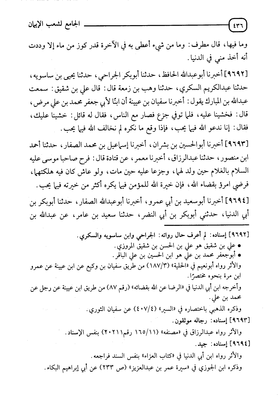 9692 - أَخْبَرَنَا أَبُو عَبْدِ اللهِ الْحَافِظُ , نَا أَبُو بَكْرٍ الْجَرَّاحِيُّ , نَا يَحْيَى بْنُ سَاسَوَيْهِ , نَا عَبْدُ الْكَرِيمِ السُّكَّرِيُّ , نَا وَهْبُ بْنُ زَمْعَةَ , قَالَ: قَالَ عَلِيُّ بْنُ شَقِيقٍ: سَمِعْتُ عَبْدَ اللهِ بْنَ الْمُبَارَكِ , يَقُولُ: أَنَا سُفْيَانُ بْنُ عُيَيْنَةَ ,: أَنَّ ابْنًا لِأَبِي جَعْفَرٍ مُحَمَّدِ بْنِ عَلِيٍّ مَرِضَ , قَالَ: فَخَشِينَا عَلَيْهِ , فَلَمَّا تُوُفِّيَ جَزِعَ عَلَيْهِ , فَصَارَ مَعَ النَّاسِ فَقَالَ لَهُ قَائِلٌ: خَشِينَا عَلَيْكَ فَقَالَ: §" إِنَّا نَدْعُو اللهَ فِيمَا نُحِبُّ فَإِذَا وَقَعَ مَا نَكْرَهُ لَمْ نُخَالِفِ اللهَ فِيمَا يُحِبُّ "