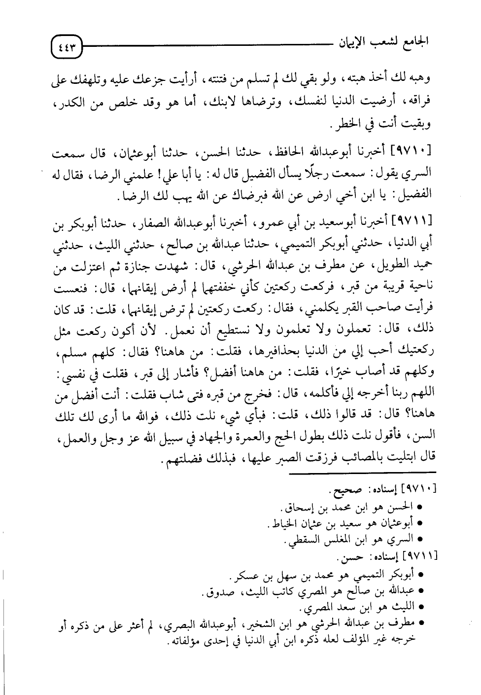 9710 - أَخْبَرَنَا أَبُو عَبْدِ اللهِ الْحَافِظُ , أَنَا الْحَسَنُ , نَا أَبُو عُثْمَانَ , قَالَ: سَمِعْتُ السَّرِيَّ , يَقُولُ: سَمِعْتُ رَجُلًا يَسْأَلُ الْفُضَيْلَ , قَالَ لَهُ: يَا أَبِي عَلِيٍّ , عَلِّمْنِي الرِّضَا , فَقَالَ لَهُ الْفُضَيْلُ: " يَا ابْنَ أَخِي , §ارْضَ عَنِ اللهِ , فَبِرِضَاكَ عَنِ اللهِ يَهَبُ لَكَ الرِّضَا "