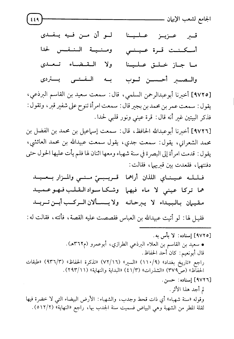 9726 - أَخْبَرَنَا أَبُو عَبْدِ اللهِ الْحَافِظُ , قَالَ: سَمِعْتُ إِسْمَاعِيلَ بْنَ مُحَمَّدِ بْنِ الْفَضْلِ بْنِ مُحَمَّدٍ الشَّعْرَانِيُّ , يَقُولُ: سَمِعْتُ جَدِّي , يَقُولُ: سَمِعْتُ عُبَيْدَ اللهِ بْنَ مُحَمَّدٍ الْعَائِشِيُّ , يَقُولُ:" قَدِمَتِ امْرَأَةٌ إِلَى الْبَصْرَةِ فِي سَنَةٍ شَهْبَاءَ , وَمَعَهَا اثْنَانِ لَهَا , فَلَمْ يَأْتِ عَلَيْهَا الْحَوْلُ حَتَّى دَفَنَتْهُمَا فَقَعَدَتْ بَيْنَ قَبْرَيْهِمَا فَقَالَتْ: