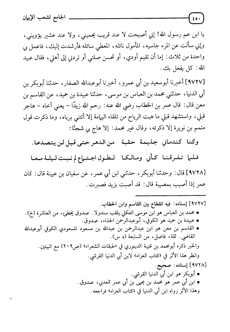 9727 - أَخْبَرَنَا أَبُو سَعِيدِ بْنُ أَبِي عَمْرٍو , أَنَا أَبُو عَبْدِ اللهِ الصَّفَّارُ , نَا أَبُو بَكْرِ بْنُ أَبِي الدُّنْيَا , حَدَّثَنِي مُحَمَّدُ بْنُ الْعَبَّاسِ بْنِ مُوسَى , نَا عَبِيدَةُ بْنُ حُمَيْدٍ , عَنِ الْقَاسِمِ بْنِ مَعْنٍ , قَالَ: قَالَ عُمَرُ بْنُ الْخَطَّابِ رَضِيَ اللهُ عَنْهُ:" §رَحِمَ اللهُ زَيْدًا - يَعْنِي: أَخَاهُ - هَاجَرَ قَبْلِي , وَاسْتُشْهِدَ قَبْلِي , مَا هَبَّتِ الرِّيَاحُ مِنْ تِلْقَاءِ الْيَمَامَةِ إِلَّا أَتَتْنِي بِرَيَّاهُ، وَمَا ذَكَرْتُ قَوْلَ مُتَمِّمِ بْنِ نُوَيْرَةَ إِلَّا ذَكَرْتُهُ , وَقَالَ غَيْرُ مُحَمَّدٍ: إِلَّا هاجَ بِي شَجِيًّا: