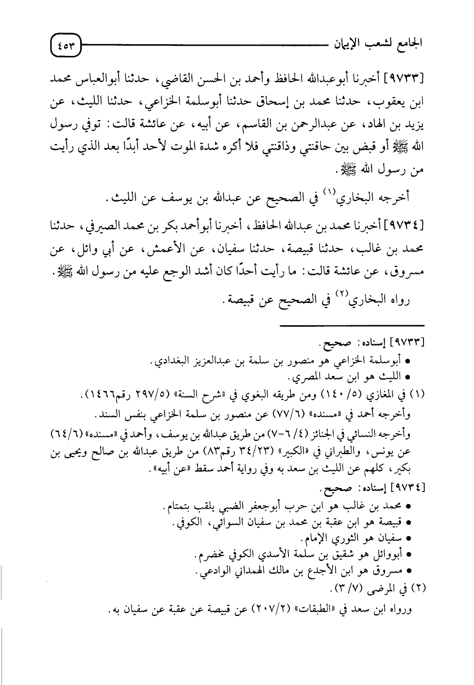 9733 - أَخْبَرَنَا أَبُو عَبْدِ اللهِ الْحَافِظُ , وَأَحْمَدُ بْنُ الْحَسَنِ الْقَاضِي , نَا أَبُو الْعَبَّاسِ مُحَمَّدُ بْنُ يَعْقُوبَ , نَا مُحَمَّدُ بْنُ إِسْحَاقَ , عَنْ أَبِي سَلَمَةَ الْخُزَاعِيِّ , أَنَا اللَّيْثُ , عَنْ يَزِيدَ بْنِ الْهَادِ , عَنْ عَبْدِ الرَّحْمَنِ بْنِ الْقَاسِمِ , عَنْ أَبِيهِ , عَنْ عَائِشَةَ , قَالَتْ: §" تُوُفِّيَ رَسُولُ اللهِ صَلَّى اللَّهُ عَلَيْهِ وَسَلَّمَ - أَوْ قُبِضَ - بَيْنَ حَاقِنَتِي وَذَاقِنَتِي , فَلَا أَكْرَهُ شِدَّةَ الْمَوْتِ لِأَحَدٍ أَبَدًا بَعْدَ الَّذِي رَأَيْتُ مِنْ رَسُولِ اللهِ صَلَّى اللَّهُ عَلَيْهِ وَسَلَّمَ ". أَخْرَجَهُ الْبُخَارِيُّ فِي الصَّحِيحِ , عَنْ عَبْدِ اللهِ بْنِ يُوسُفَ , عَنِ اللَّيْثِ