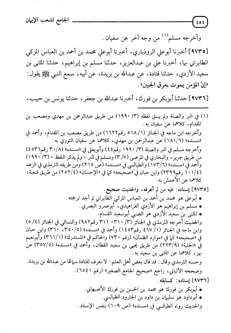 9735 - أَخْبَرَنَا أَبُو عَلِيٍّ الرُّوذْبَارِيُّ , أَنَا أَبُو عَلِيٍّ مُحَمَّدُ بْنُ أَحْمَدَ بْنِ الْعَبَّاسِ الْمُزَكِّي الطَّابِرَانِيُّ بِهَا , أَنَا عَلِيُّ بْنُ عَبْدِ الْعَزِيزِ , نَا مُسْلِمُ بْنُ إِبْرَاهِيمَ , نَا الْمُثَنَّى بْنُ سَعِيدٍ الْأَزْدِيُّ , نَا قَتَادَةُ , عَنْ عَبْدِ اللهِ بْنِ بُرَيْدَةَ , عَنْ أَبِيهِ , سَمِعَ النَّبِيَّ صَلَّى اللَّهُ عَلَيْهِ وَسَلَّمَ يَقُولُ: " إِنَّ §الْمُؤْمِنَ يَمُوتُ بِعَرَقِ الْجَبِينِ "
