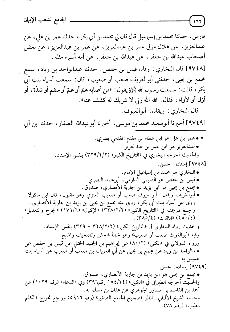 9748 - قَالَ الْبُخَارِيُّ: وَقَالَ قَيْسُ بْنُ حَفْصٍ: نَا عَبْدُ الْوَاحِدِ بْنُ زِيَادٍ , سَمِعَ مُجَمِّعَ بْنَ يَحْيَى , حَدَّثَنِي أَبُو الْغَرِيفِ صَعْبٌ، أَوْ صُعَيْبٌ , قَالَ: سَمِعْتُ أَسْمَاءَ بِنْتَ أَبِي بَكْرٍ , قَالَتْ: سَمِعْتُ رَسُولَ اللهِ صَلَّى اللَّهُ عَلَيْهِ وَسَلَّمَ يَقُولُ: §" مَنْ أَصَابَهُ هَمٌّ أَوْ غَمٌّ أَوْ سَقَمٌ أَوْ شِدَّةٌ أَوْ أَزَلٌ أَوْ لَأْوَاءٌ فَقَالَ: اللهُ اللهُ رَبِّي لَا شَرِيكَ لَهُ كُشِفَ عَنْهُ ". قَالَ الْبُخَارِيُّ: " وَيُقَالُ: أَبُو الْعَيُوفِ "