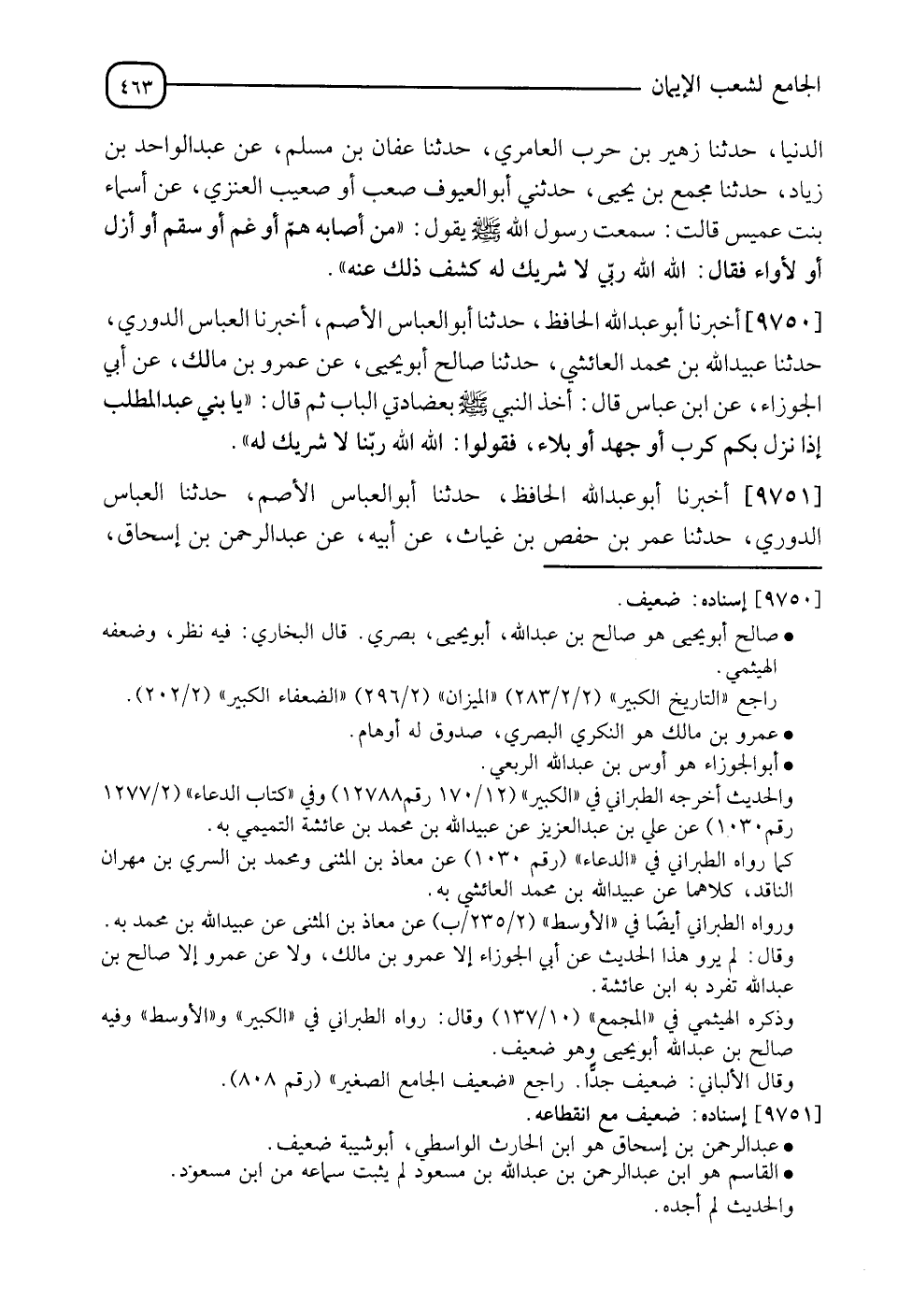 9750 - أَخْبَرَنَا أَبُو عَبْدِ اللهِ الْحَافِظُ , نَا أَبُو الْعَبَّاسِ الْأَصَمُّ , أَنَا الْعَبَّاسُ الدُّورِيُّ , نَا عُبَيْدُ اللهِ بْنُ مُحَمَّدٍ الْعَائِشِيُّ , نَا صَالِحٌ أَبُو يَحْيَى , عَنْ عَمْرِو بْنِ مَالِكٍ , عَنْ أَبِي الْجَوْزَاءِ , عَنِ ابْنِ عَبَّاسٍ قَالَ: أَخَذَ النَّبِيُّ صَلَّى اللَّهُ عَلَيْهِ وَسَلَّمَ بِعِضَادَتَيِ الْبَابِ ثُمَّ قَالَ: " يَا بَنِي عَبْدِ الْمُطَّلِبِ , §إِذَا نَزَلَ بِكُمْ كَرْبٌ أَوْ جَهْدٌ أَوْ بَلَاءٌ فَقُولُوا: اللهُ اللهُ رَبُّنَا لَا شَرِيكَ لَهُ "