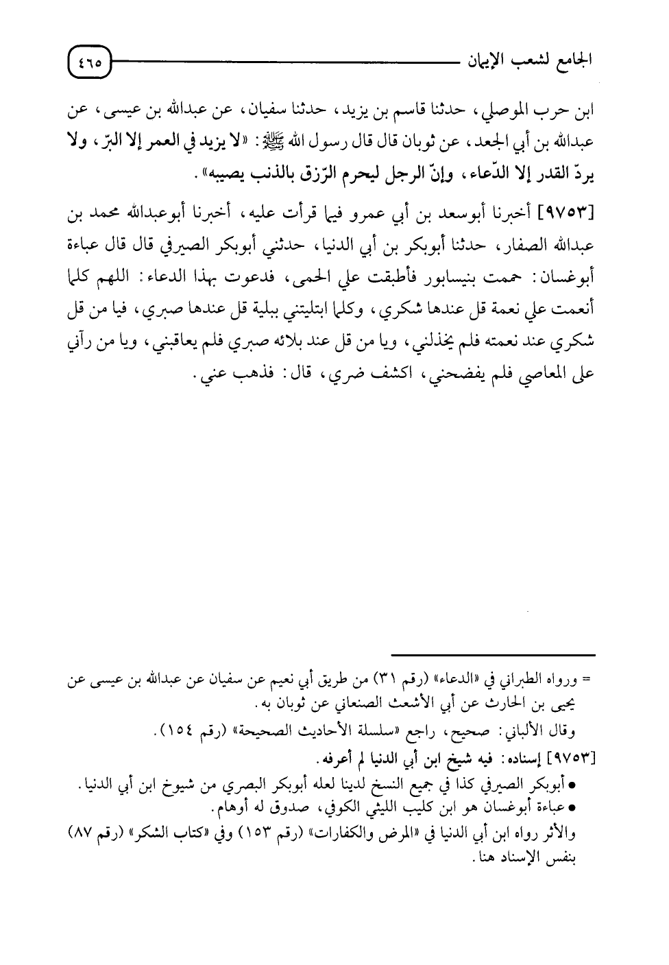 9753 - أَخْبَرَنَا أَبُو سَعِيدِ بْنُ أَبِي عَمْرٍو , فِيمَا قَرَأْتُ عَلَيْهِ , أَنَا أَبُو عَبْدِ اللهِ مُحَمَّدُ بْنُ عَبْدِ اللهِ الصَّفَّارُ , نَا أَبُو بَكْرِ بْنُ أَبِي الدُّنْيَا , حَدَّثَنِي أَبُو بَكْرٍ الصَّيْرَفِيُّ , قَالَ عَبَايَةُ أَبُو غَسَّانَ: " §حُمِمْتُ بِنَيْسَابُورَ فَأَطْبَقَتْ عَلَيَّ الْحُمَّى , فَدَعَوْتُ بِهَذَا الدُّعَاءِ: اللهُمَّ كُلَّمَا أَنْعَمْتَ عَلَيَّ نِعْمَةً قَلَّ عِنْدَهَا شُكْرِي , وَكُلَّمَا ابْتَلَيْتَنِي بِبَلِيَةٍ قَلَّ عِنْدَهَا صَبْرَى , فَيَا مَنْ قَلَّ شُكْرِي عِنْدَ نِعْمَتِهِ فَلَمْ يَخْذُلْنِي وَيَا مَنْ قَلَّ عِنْدَ بَلَائِهِ صَبْرِي , فَلَمْ يُعَاقِبْنِي , وَيَا مَنْ رَآنِي عَلَى الْمَعَاصِي فَلَمْ يَفْضَحْنِي , اكْشِفْ ضُرِّي , قَالَ: فَذَهَبَ عَنِّي "