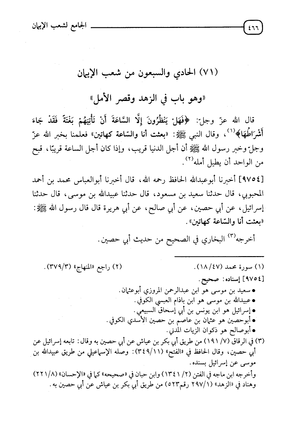 §الْحَادِي وَالسَّبْعُونَ مِنْ شُعَبِ الْإِيمَانِ وَهُوَ بَابٌ فِي الزُّهْدِ وَقِصَرِ الْأَمَلِ , قَالَ اللهُ عَزَّ وَجَلَّ: {فَهَلْ يَنْظُرُونَ إِلَّا السَّاعَةَ أَنْ تَأْتِيَهُمْ بَغْتَةً فَقَدْ جَاءَ أَشْرَاطُهَا} [محمد: 18] وَقَالَ النَّبِيُّ صَلَّى اللَّهُ عَلَيْهِ وَسَلَّمَ: " بُعِثْتُ أَنَا وَالسَّاعَةُ كَهَاتَيْنِ " فَعَلِمْنَا بِخَبَرِ اللهِ عَزَّ وَجَلَّ وَخَبَرِ رَسُولِ اللهِ صَلَّى اللَّهُ عَلَيْهِ وَسَلَّمَ أَنَّ أَجَلَ الدُّنْيَا قَرِيبٌ , وَإِذَا كَانَ أَجْلُ السَّاعَةِ قَرِيبًا قَبُحَ مِنَ الْوَاحِدِ أَنْ يُطِيلَ أَمَلَهُ