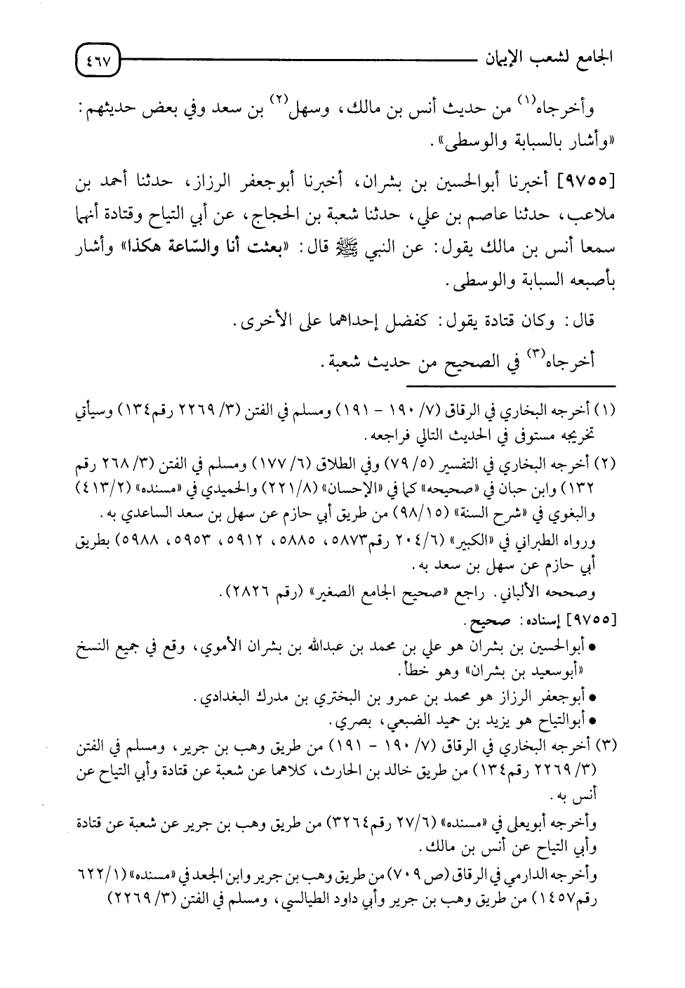 9755 - أَخْبَرَنَا أَبُو الْحُسَيْنِ بْنُ بُشْرَانَ , قَالَ: أَنَا أَبُو جَعْفَرٍ الرَّزَّازُ , نَا أَحْمَدُ بْنُ مُلَاعِبٍ , نَا عَاصِمُ بْنُ عَلِيٍّ , نَا شُعْبَةُ بْنُ الْحَجَّاجِ , عَنْ أَبِي التَّيَّاحِ , وَقَتَادَةَ , أَنَّهُمَا سَمِعَا أَنَسَ بْنَ مَالِكٍ يَقُولُ: عَنِ النَّبِيِّ صَلَّى اللَّهُ عَلَيْهِ وَسَلَّمَ قَالَ: §" بُعِثْتُ أَنَا وَالسَّاعَةُ هَكَذَا , وَأَشَارَ بِأُصْبُعَيْهِ السَّبَّابَةِ وَالْوُسْطَى " , قَالَ: وَكَانَ قَتَادَةُ يَقُولُ: كَفَضْلِ إِحْدَيْهِمَا عَلَى الْأُخْرَى. أَخْرَجَاهُ فِي الصَّحِيحِ مِنْ حَدِيثِ شُعْبَةَ